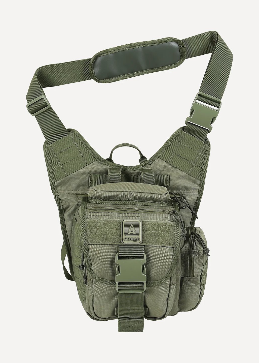 Боковой карман с усиливающей вставкой и стропами MOLLE. Удобный широкий регулируемый плечевой ремень со съемной мягкой накладкой.