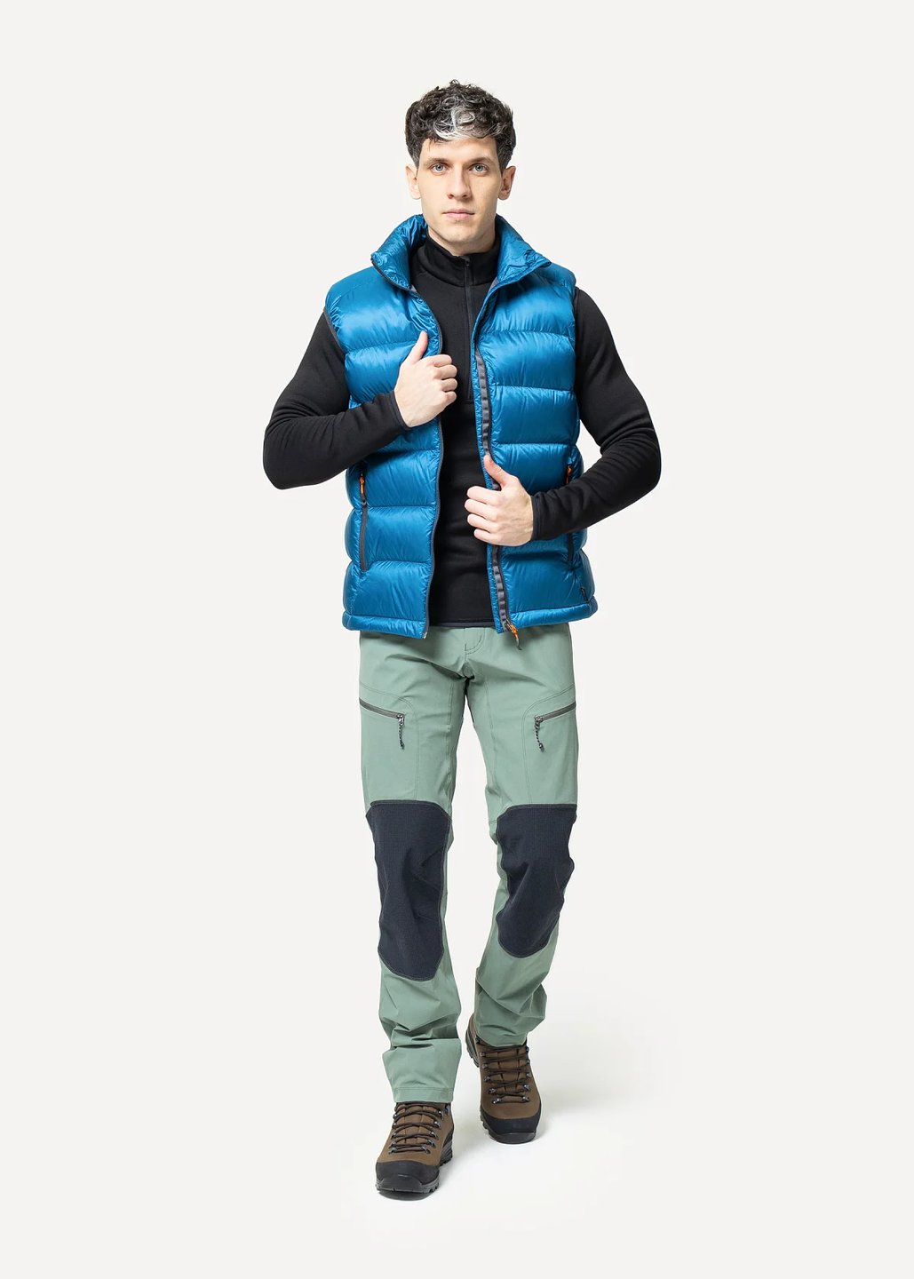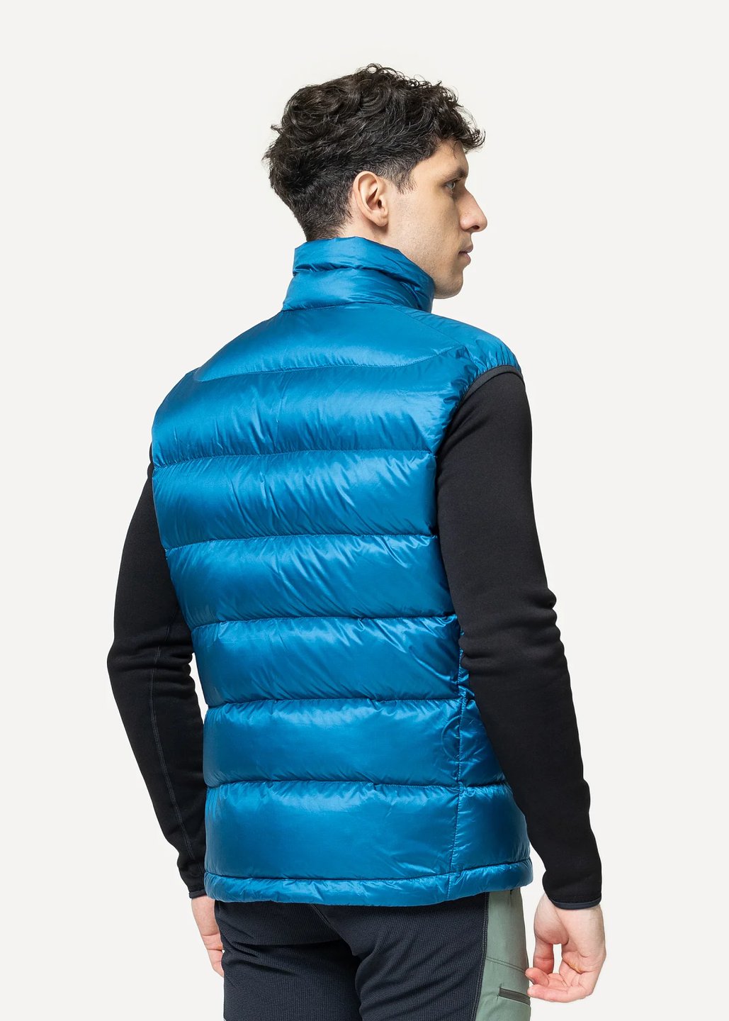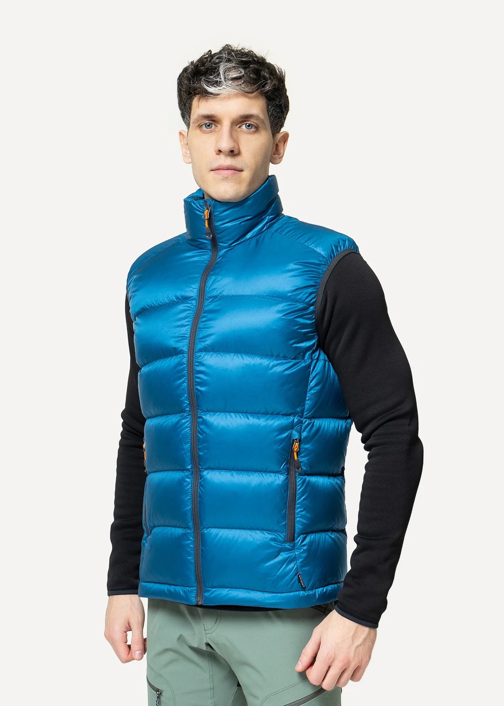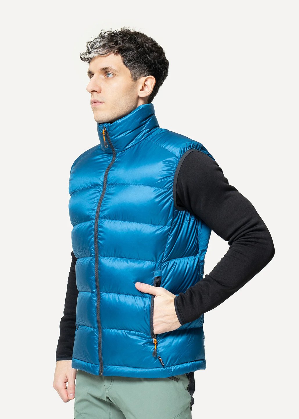 Теплый и очень легкий пуховый жилет. Компактно пакуется, что позволяет с легкостью брать его с собой и использовать как дополнительный утепляющий слой