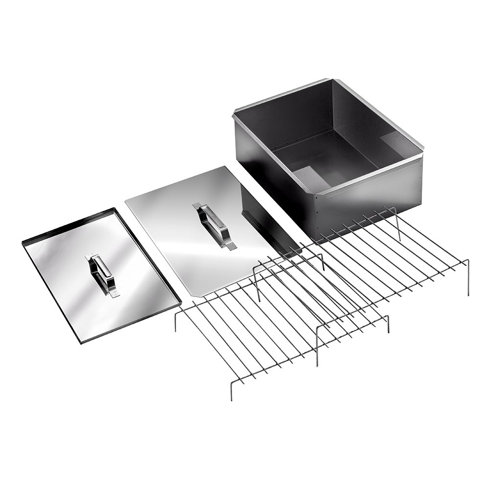 Коптильня двухъярусная выполнена из нержавеющей стали толщиной 0,8 мм. Модели из этого материала устойчивы к коррозии и высоким температурам и имеют более долгий срок службы. Коптильня оборудована плотно прилегающей крышкой, что позволяет избежать задымления и поддерживать необходимую температуру. В комплекте решетка (второй ярус) и поддон для сбора жира.