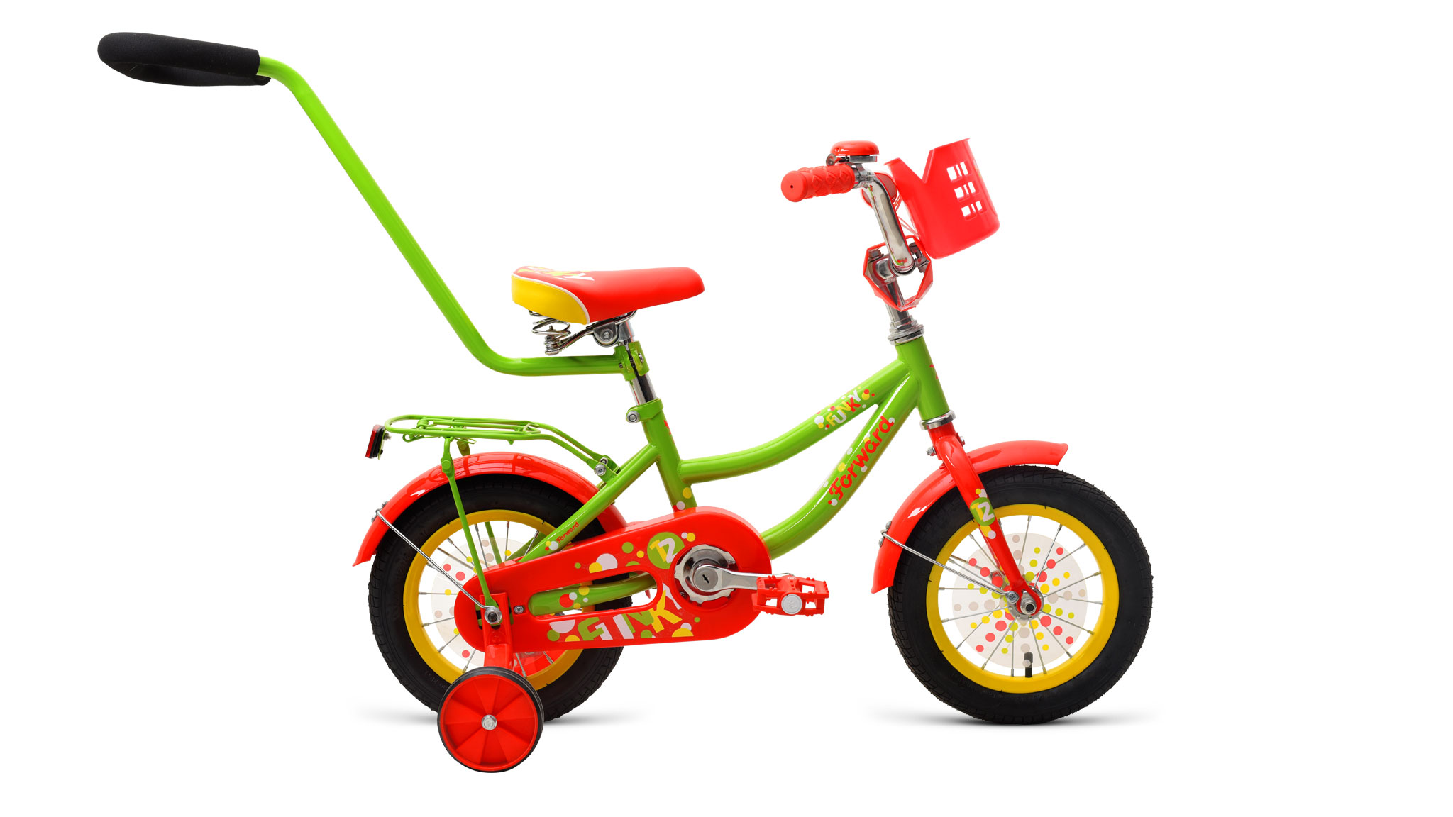 Активным детям и их родителям точно придется по вкусу велосипед Forward Funky 12, оснащенный толкателем и передней корзинкой. Благодаря оригинальной расцветке ребенок точно выделиться во дворе среди сверстников.