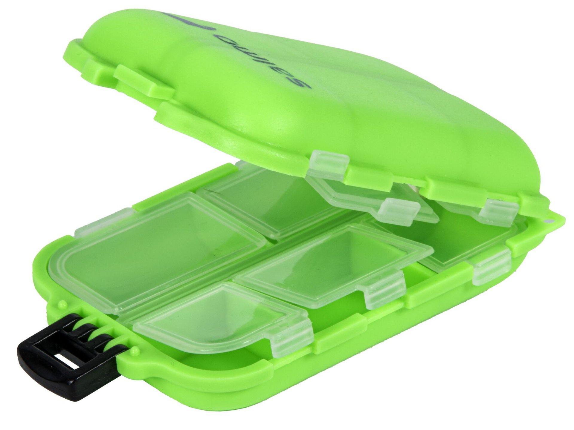Маленькая двухстворчатая коробочка для крючков и других мелочей с отделениями в каждой ее части. Каждое отделение створки имеет защитную прозрачную крышку.