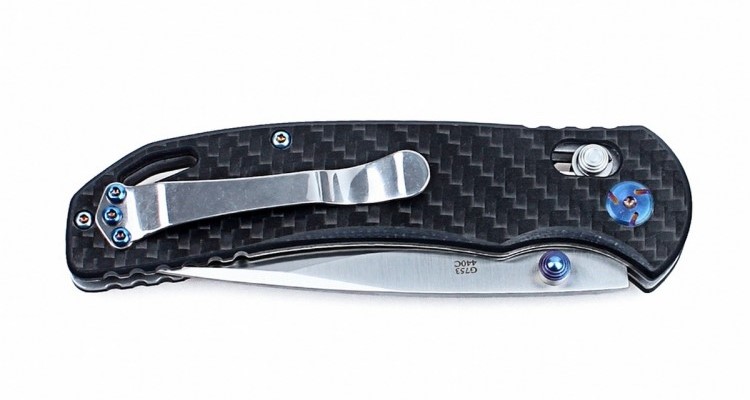 В качестве материала для ручки ножа используется современный композитный материал — углепластик, также известный как карбон. Он гораздо прочнее обыкновенного пластика, хотя остается таким же лёгким. Этот материал позволяет не бояться за целостность рукоятки ножа при выполнении работ под нагрузкой или случайных ударах. Рукоятка в модели Ganzo F7531-CF покрашена в чёрный цвет. К ней прикреплена клипса из металла, а в хвостовой части сделано небольшое отверстие для шнурка.