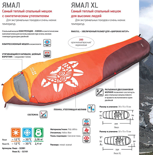 - Разъемные двух замковые молнии L/R позволяют объединить два спальных мешка (левый и правый вариант) в один двойной.