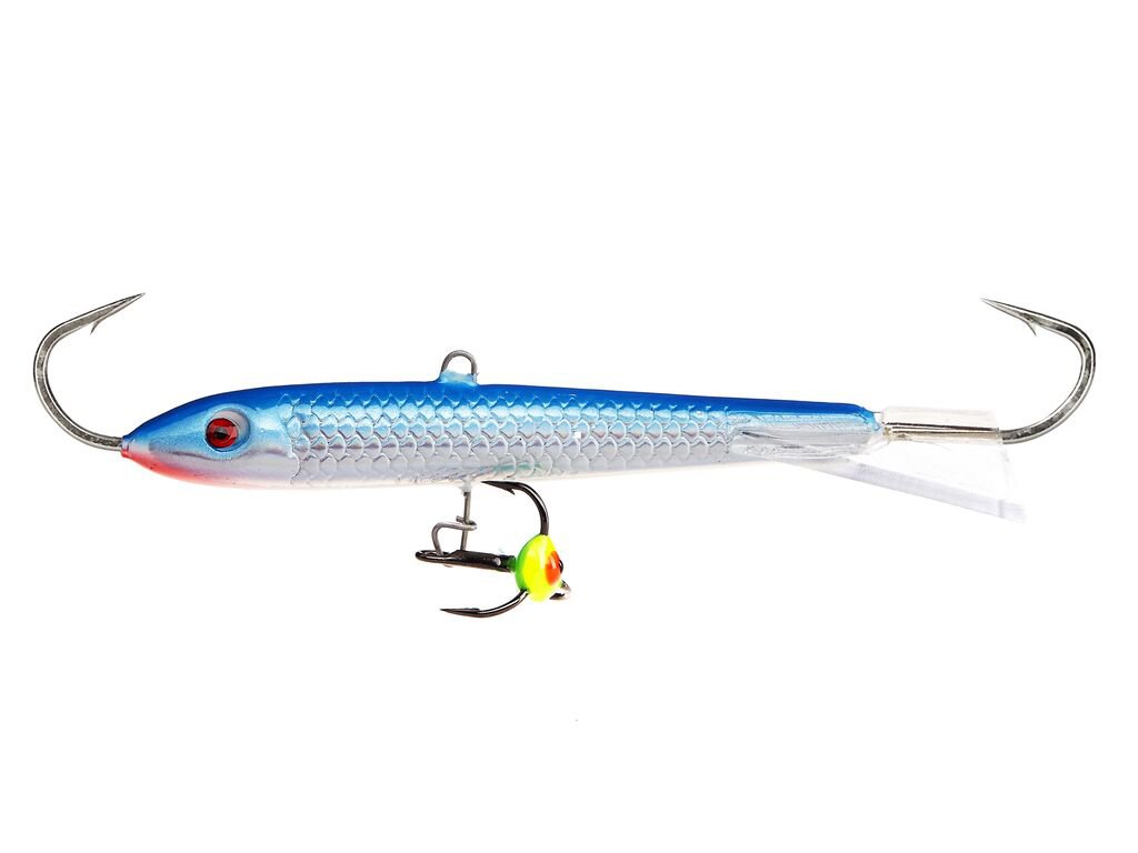 Порой щука или судак реагируют только на крупные приманки, активно перемещающиеся в придонном слое. Эти, достаточно крупные балансиры длиной 90 мм, облавливают большую площадь под лункой и издалека привлекают хищника. Не забывайте, что чем крупнее приманка, тем большая пауза нужна ей между взмахами удилища.