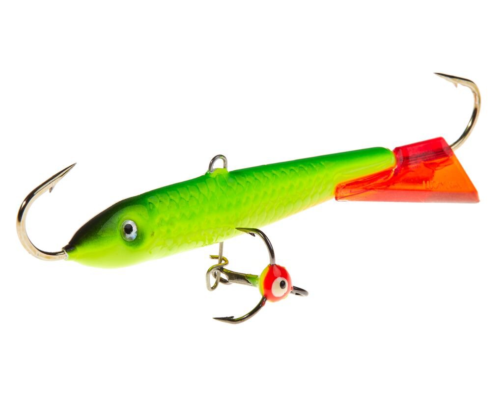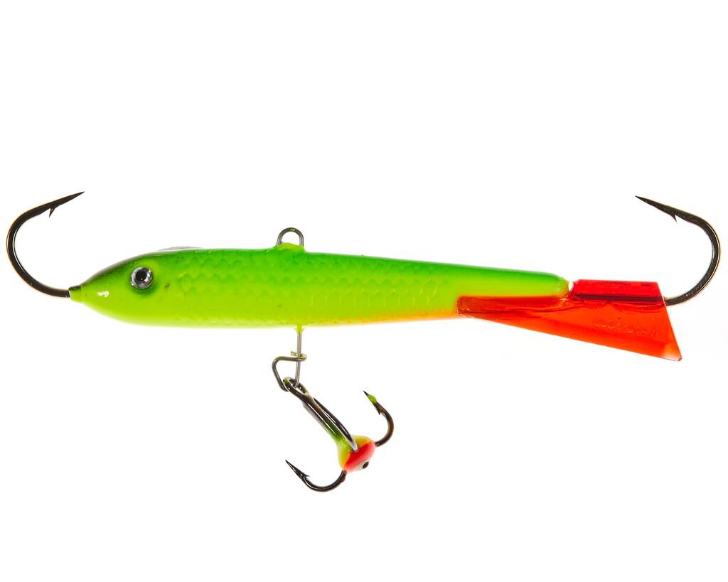 Порой щука или судак реагируют только на крупные приманки, активно перемещающиеся в придонном слое. Эти, достаточно крупные балансиры длиной 90 мм, облавливают большую площадь под лункой и издалека привлекают хищника. Не забывайте, что чем крупнее приманка, тем большая пауза нужна ей между взмахами удилища.