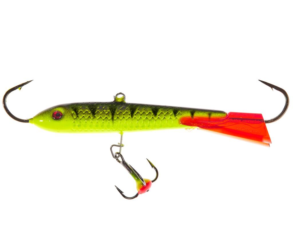 Порой щука или судак реагируют только на крупные приманки, активно перемещающиеся в придонном слое. Эти, достаточно крупные балансиры длиной 90 мм, облавливают большую площадь под лункой и издалека привлекают хищника. Не забывайте, что чем крупнее приманка, тем большая пауза нужна ей между взмахами удилища.