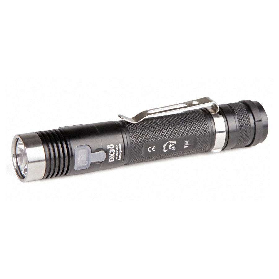 - Чёрная кнопка в торце фонаря используется для включения DX30LC2-SR в самом ярком режиме. Эта же кнопка отвечает за выключение фонаря.