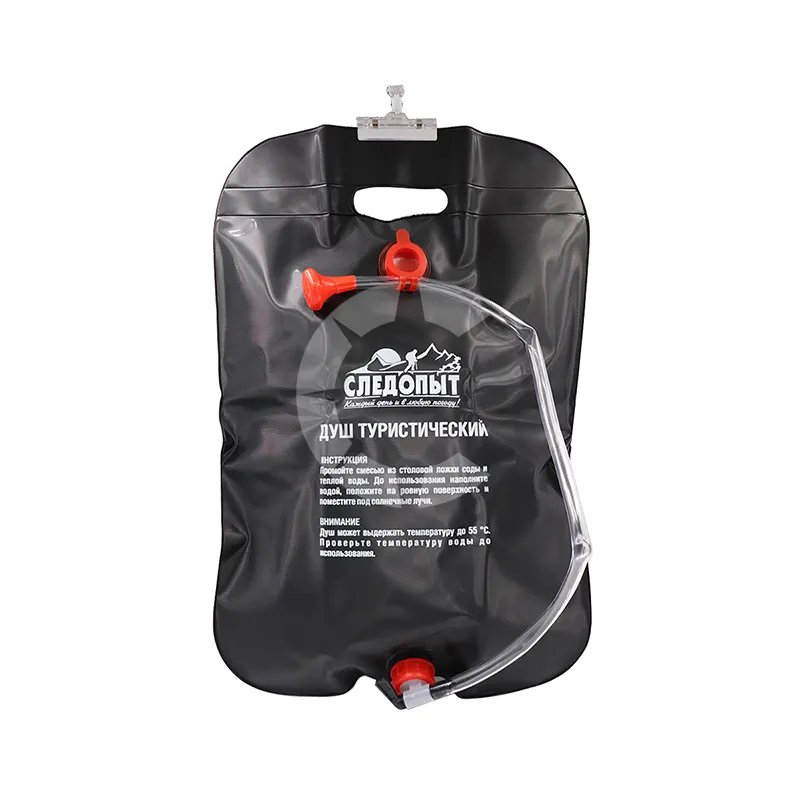 Походный душ изготовлен из прочного нетоксичного материала ПВХ, снабжён распыляющими соплами. Имеет вес всего 0,8 кг.