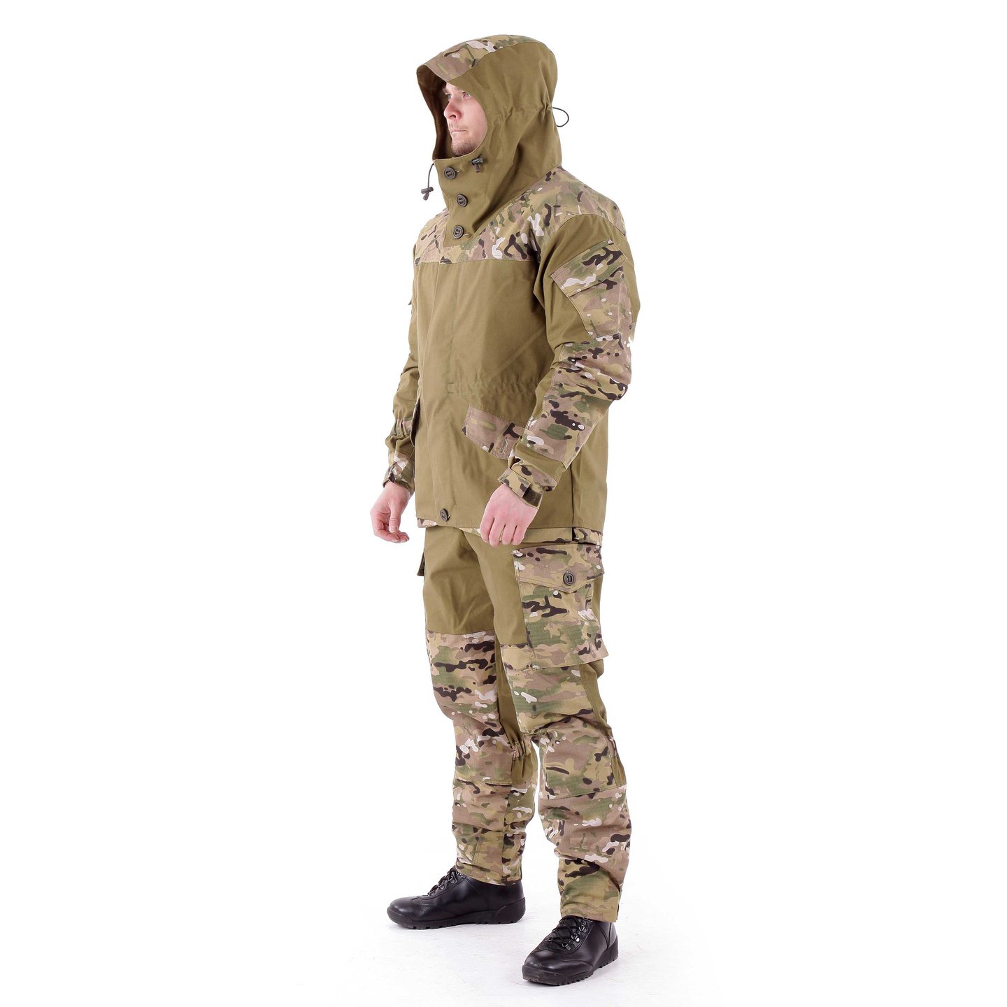 Материал костюма – палаточное полотно из 100% хлопка с усилением из износостойкой смесовой ткани. Ткань не мнется, не застирывается, не выгорает на солнце, не шуршит при движении, устойчива к истиранию и отлично пропускает пар.