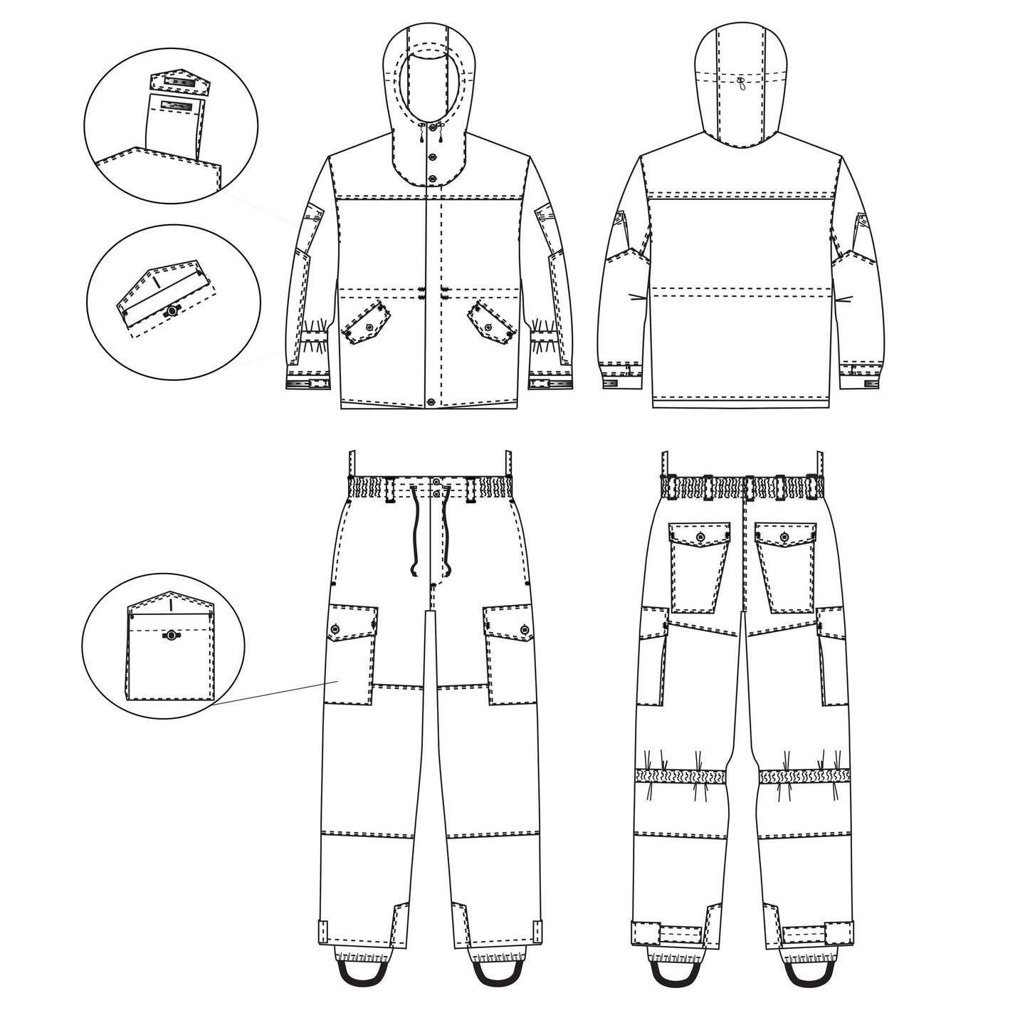 Куртка имеет свободный крой, лишний объём компенсируется регулирующим шнуром, расположенным чуть повыше пояса. Шнур затянут в кулиску и находится с внутренней стороны куртки. Второй регулирующий шнур утягивает нижний контур куртки. Это уже скрытая регулировка, поэтому никаких свисающих петель, способных цепляться за сучки и ветки, у куртки нет.