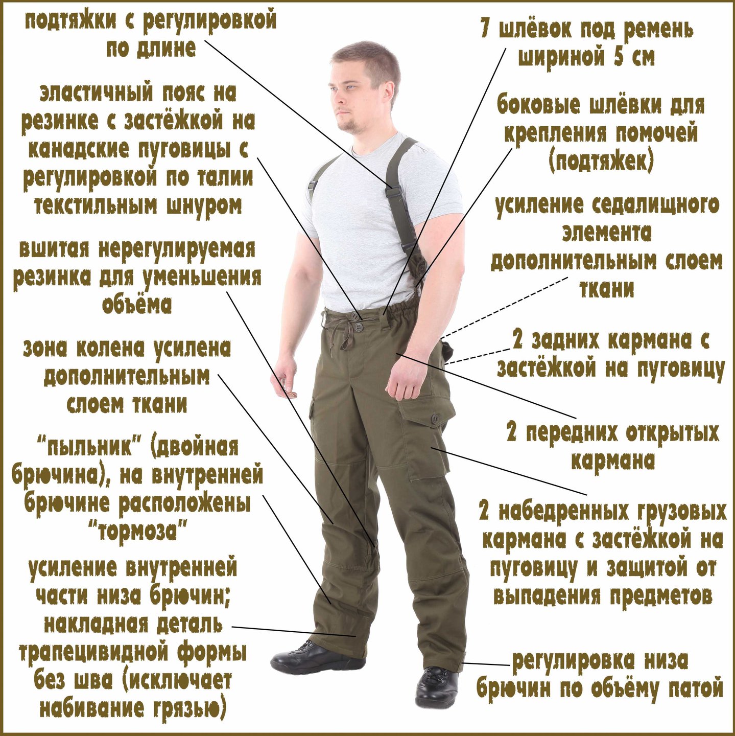 Пояс у брюк эластичный, на резинках. В поясе брюки застёгиваются на неотрывные пуговицы. Застежку дублирует прочный текстильный шнур. Гульфик также застёгивается на неотрывные пуговицы.