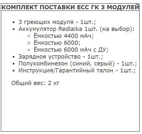 Утеплитель располагают в одежде слоями. В полукомбинезоне синтепон плотностью 200 г/м² плюс стеганная подкладка с синтепоном 100 г/м², в совокупности получается плотность 300 г/м². Это оптимальный вариант для очень холодной зимы с температурой от - 20 °C до - 25 °C. С интегрированным греющим комплектом диапазон комфортного пребывания на морозе расширяется до - 45°C.