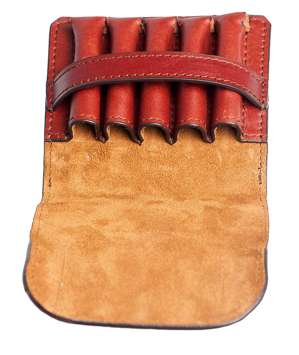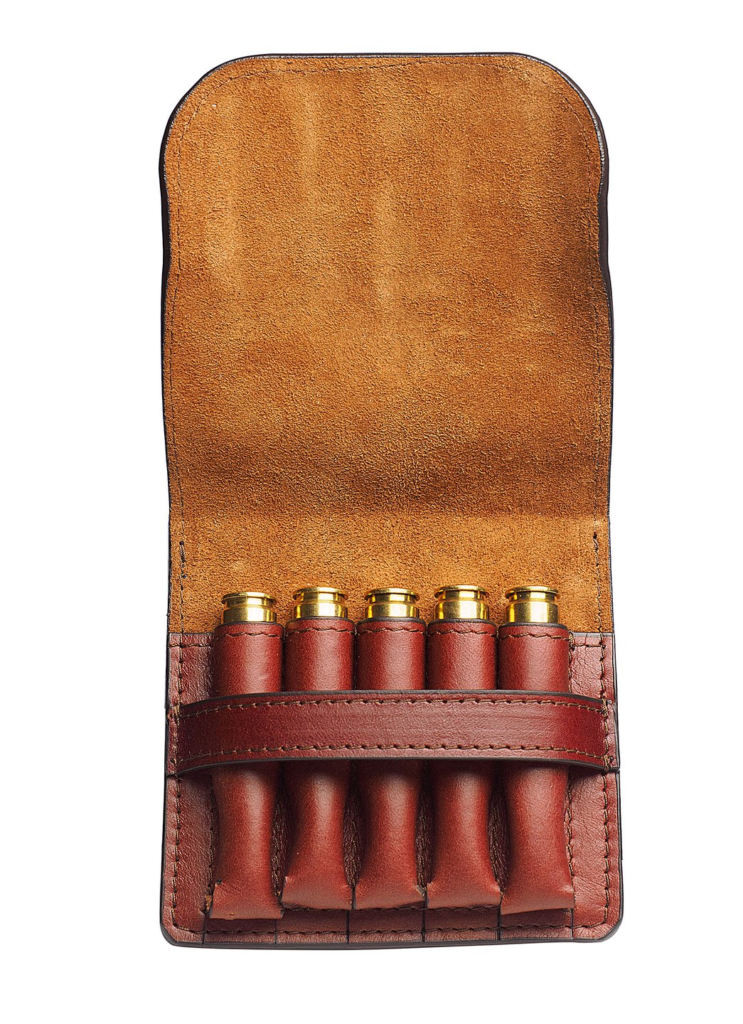 Патронташ-подсумок на 5 нарезных патронов закрытого типа. Изготовлен из натуральной кожи и замши.