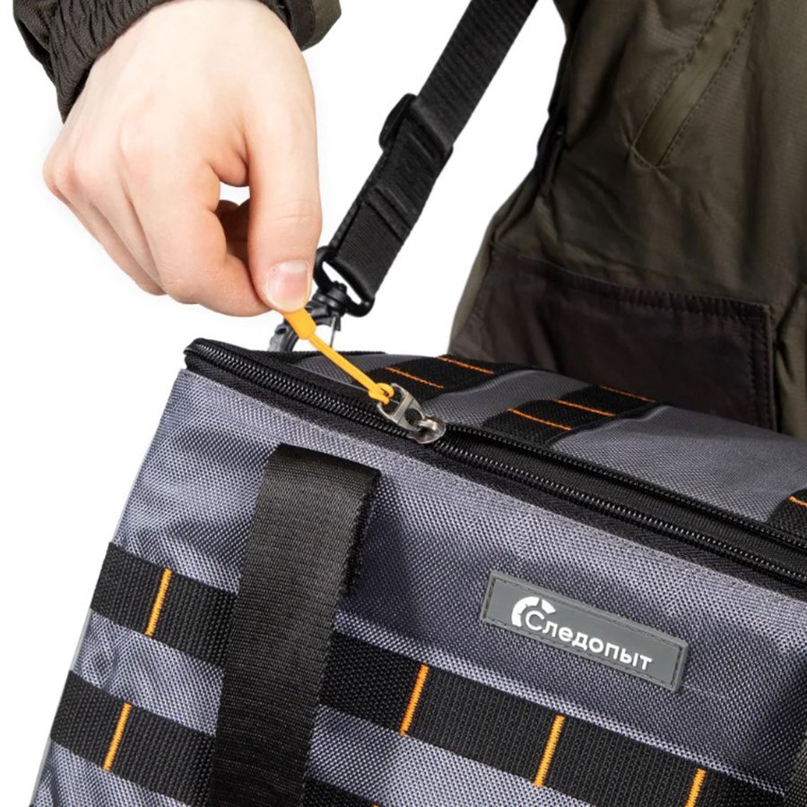 Имеет четыре площади для крепления навесных модулей: две боковые, фронтальную и на крышке сумки. Конструкцией предусмотрены D-образные полукольца для крепления ретриверов различных инструментов, ручки для переноски и съемный плечевой ремень. Сумка вертикальной закладки, комплектуется пятью коробками Следопыт Luno-28.