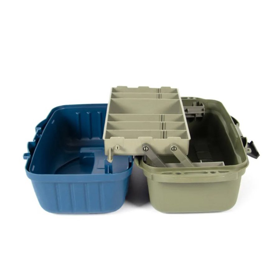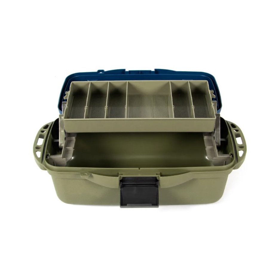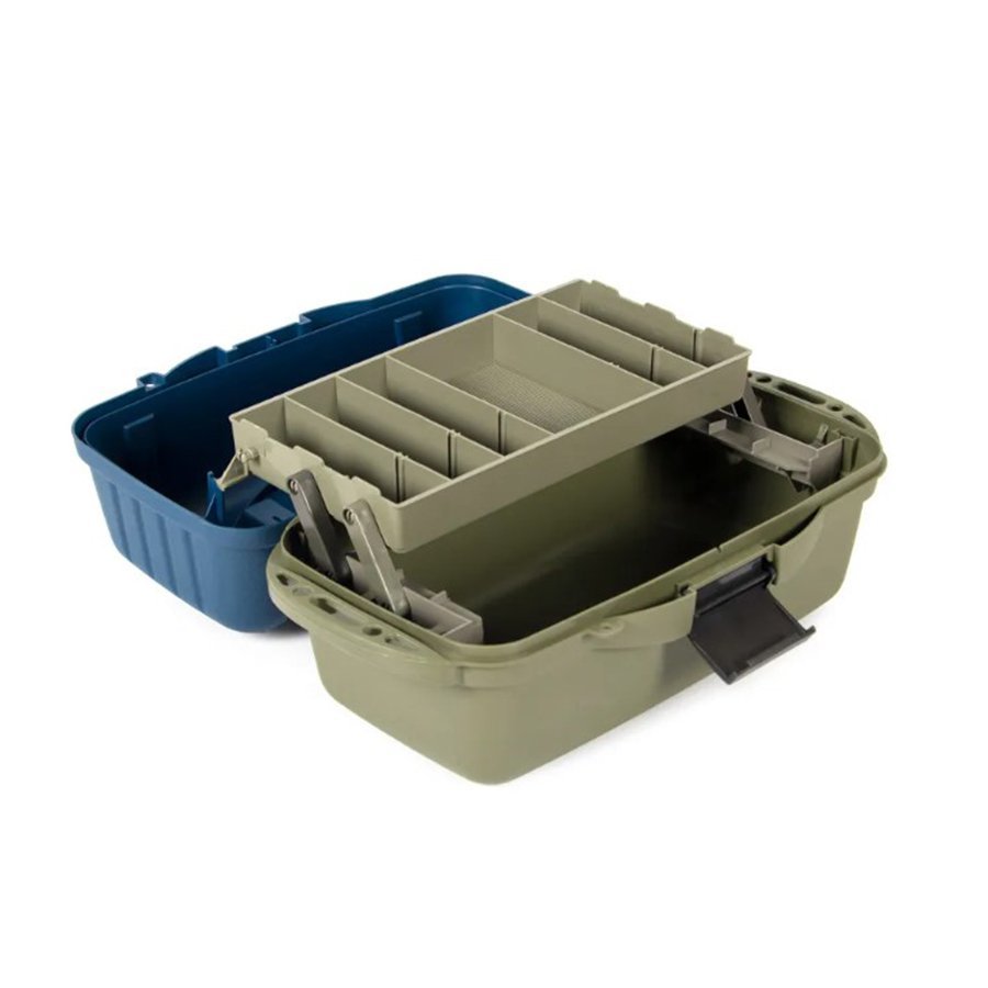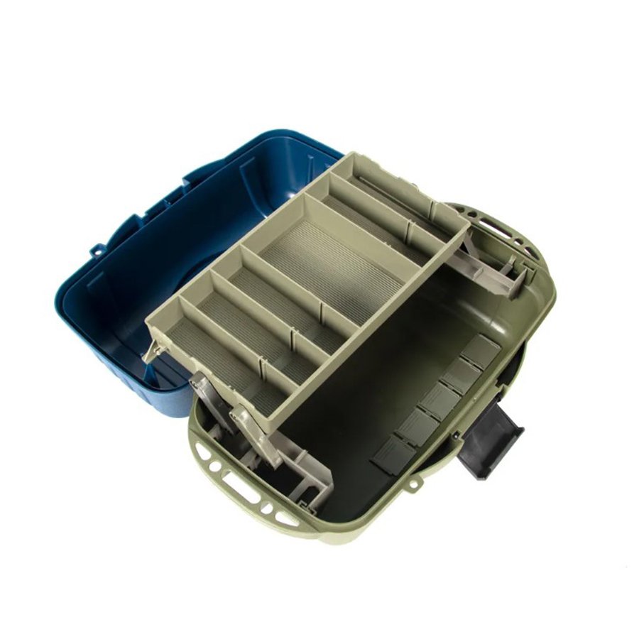 Имеет прочную защелку и поднимающиеся полки. Такая конструкция позволяет компактно хранить большое количество рыболовных снастей в одном ящике.