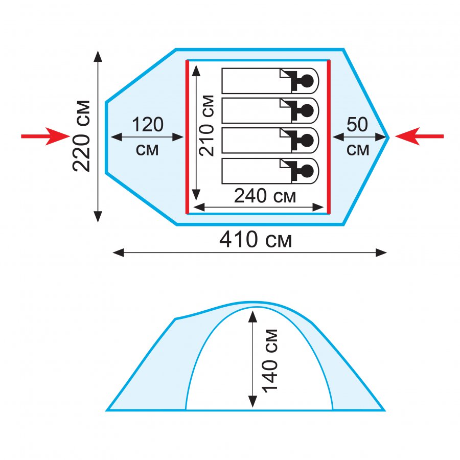 Четырехместная двухслойная туристическая палатка с вместительным тамбуром для вещей. Универсальная серия Tramp