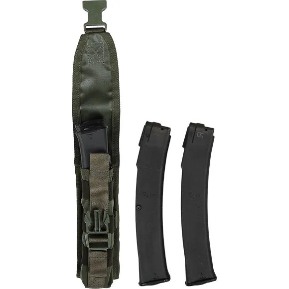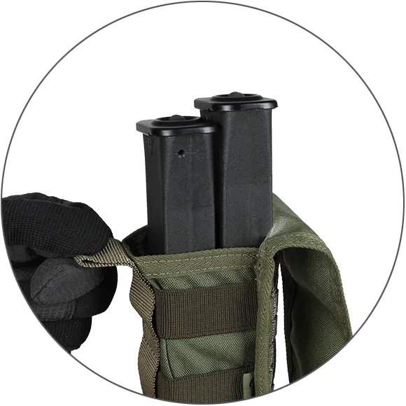 - Поперечное сечение утягивается тремя резинками-лентами, распределенными равномерно по всей высоте подсумка. Это позволяет надежно фиксировать один узкий РСП в вертикальном положении, не давая ему выпасть вбок из-под клапана подсумка, а также предотвращает выпадение предметов при открытом клапане