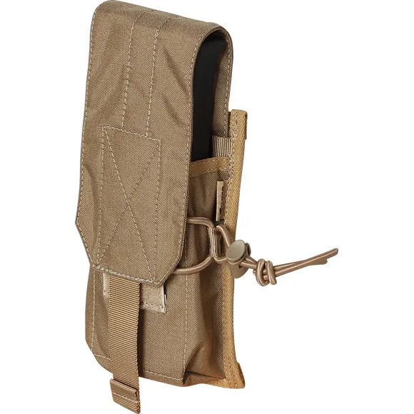 - Поперечное сечение подсумка утягивается эластичным шнуром крупного типа с регулировкой фиксатором Duraflex®. Шнур гораздо прочнее обычной широкой резинки, его можно настраивать или полностью снять, он ремонтопригоден. Благодаря утяжке подсумок может даже без застегнутого клапана надежно удерживать магазин