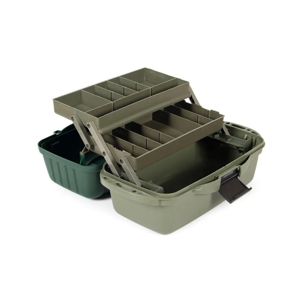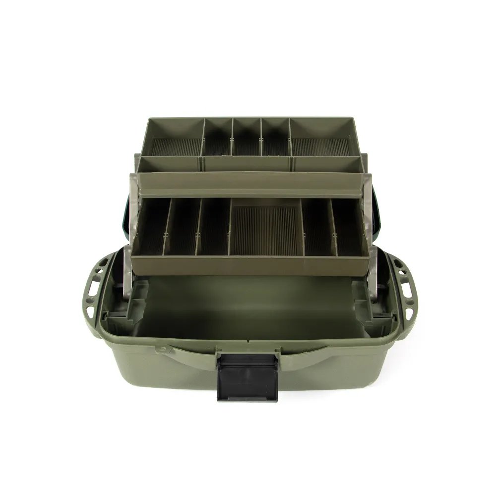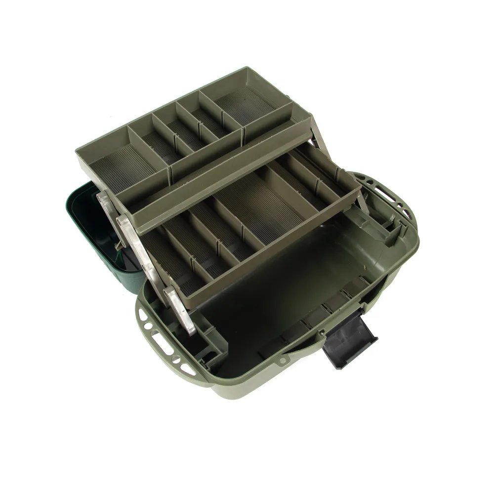 Имеет прочную защелку и поднимающиеся полки. Такая конструкция позволяет компактно хранить большое количество рыболовных снастей в одном ящике.
