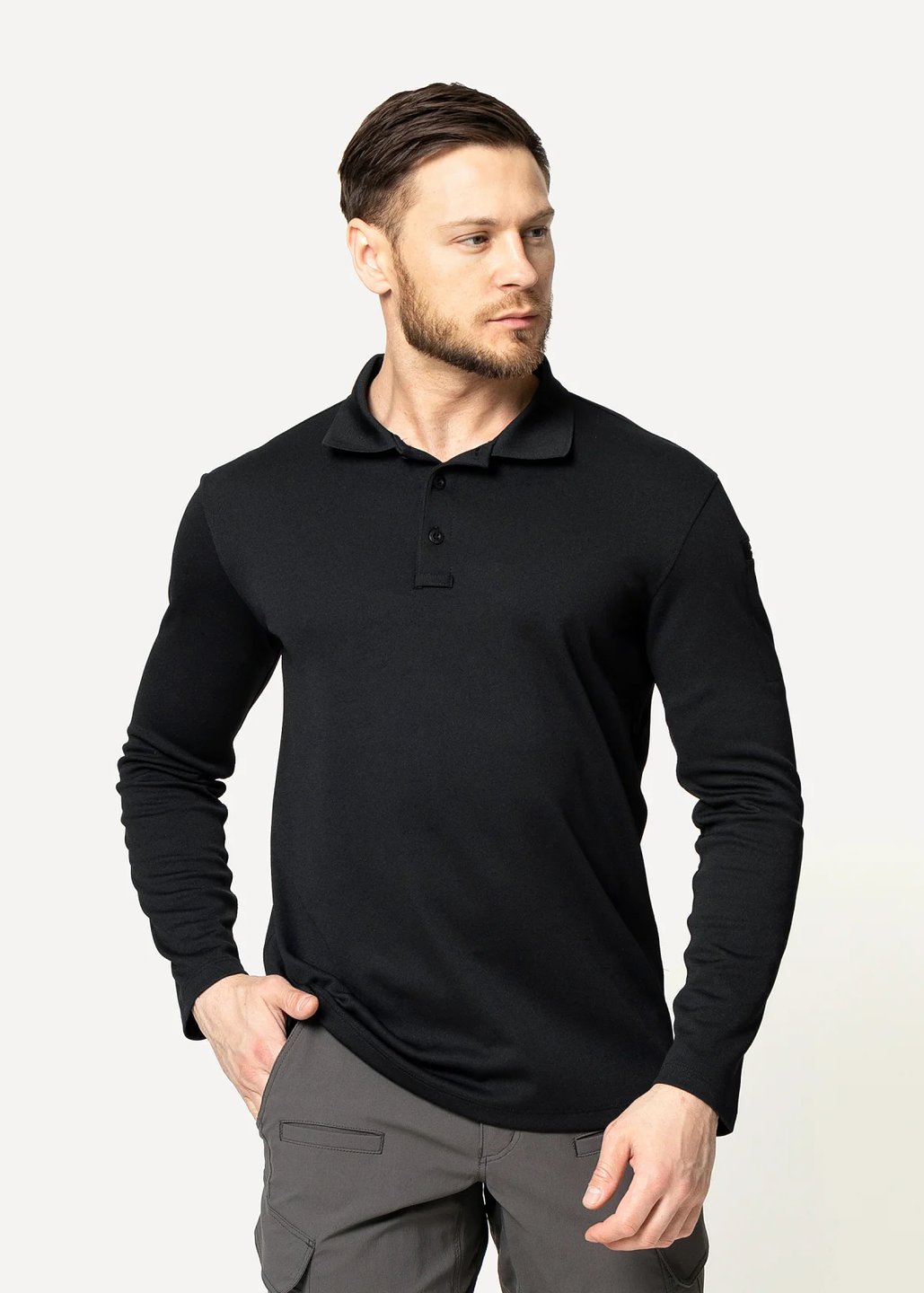 Современная модель поло с длинным рукавом из практичного синтетического трикотажа