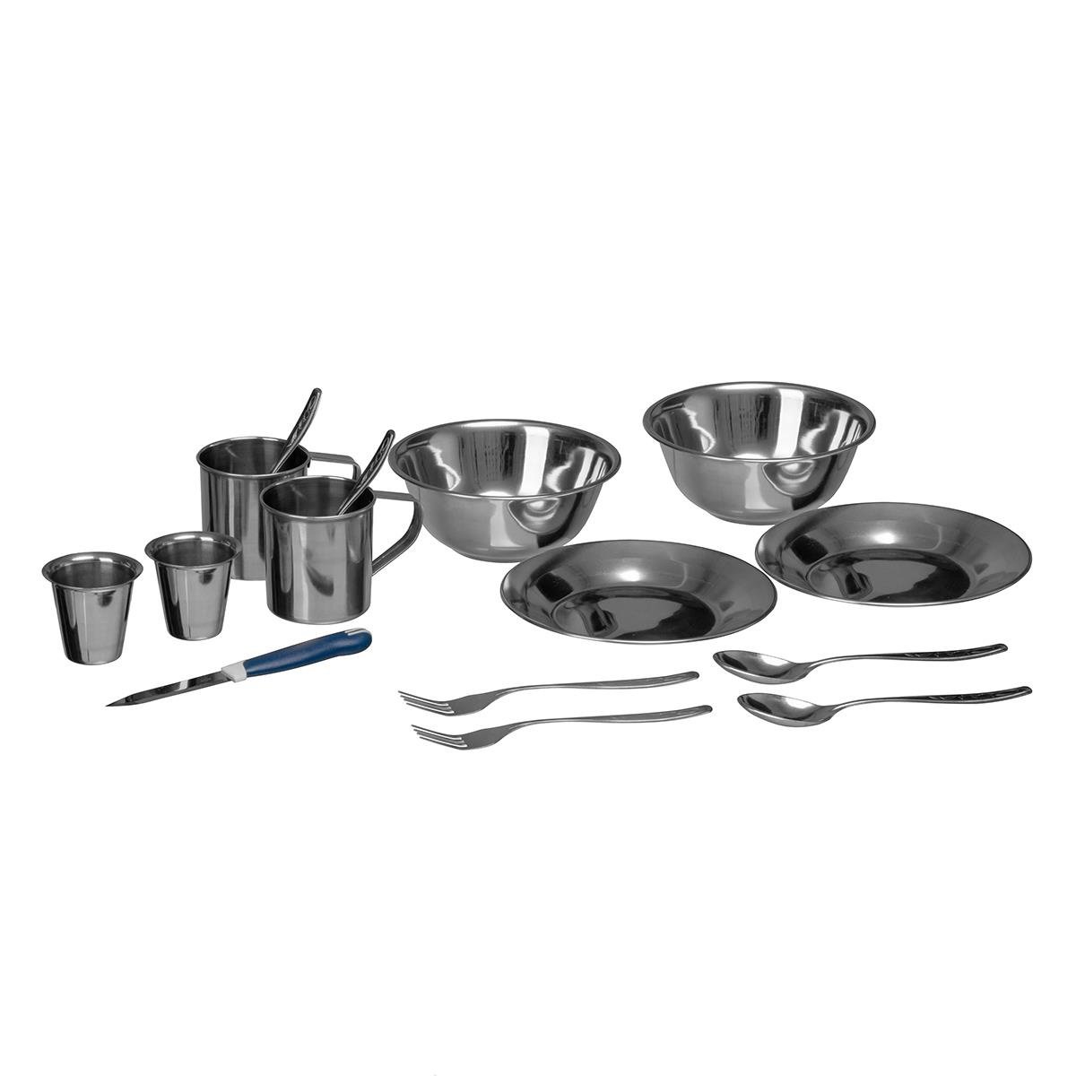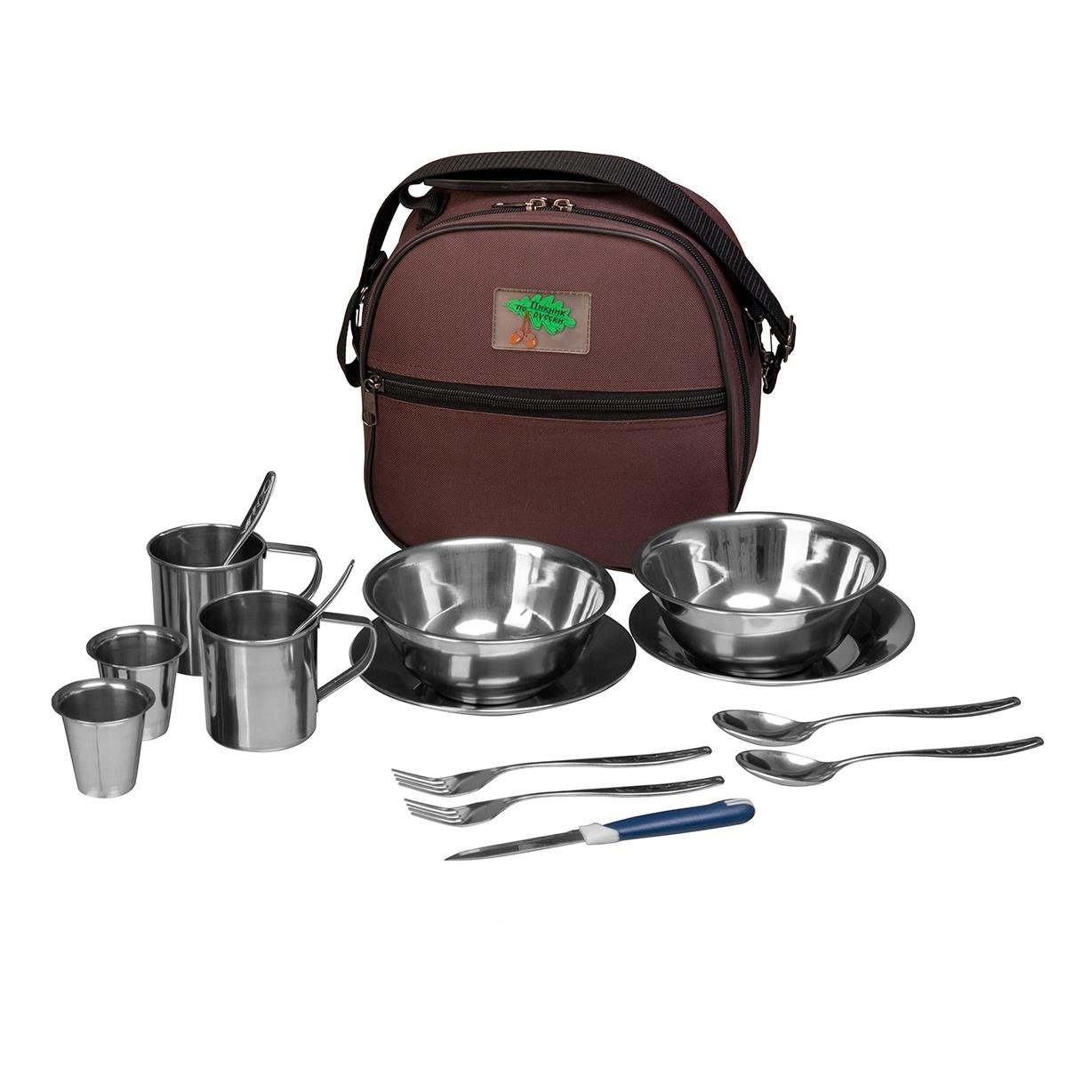 Вся необходимая посуда, чтобы два человека в любой момент могли быстро перекусить или плотно поесть в дороге или на природе, помещается в совсем небольшой кейс. Предметы для приема пищи изготовлены из легкой, прочной, долговечной нержавеющей стали, удобно упаковываются в специальные отсеки кейса и потому всегда будут под рукой.