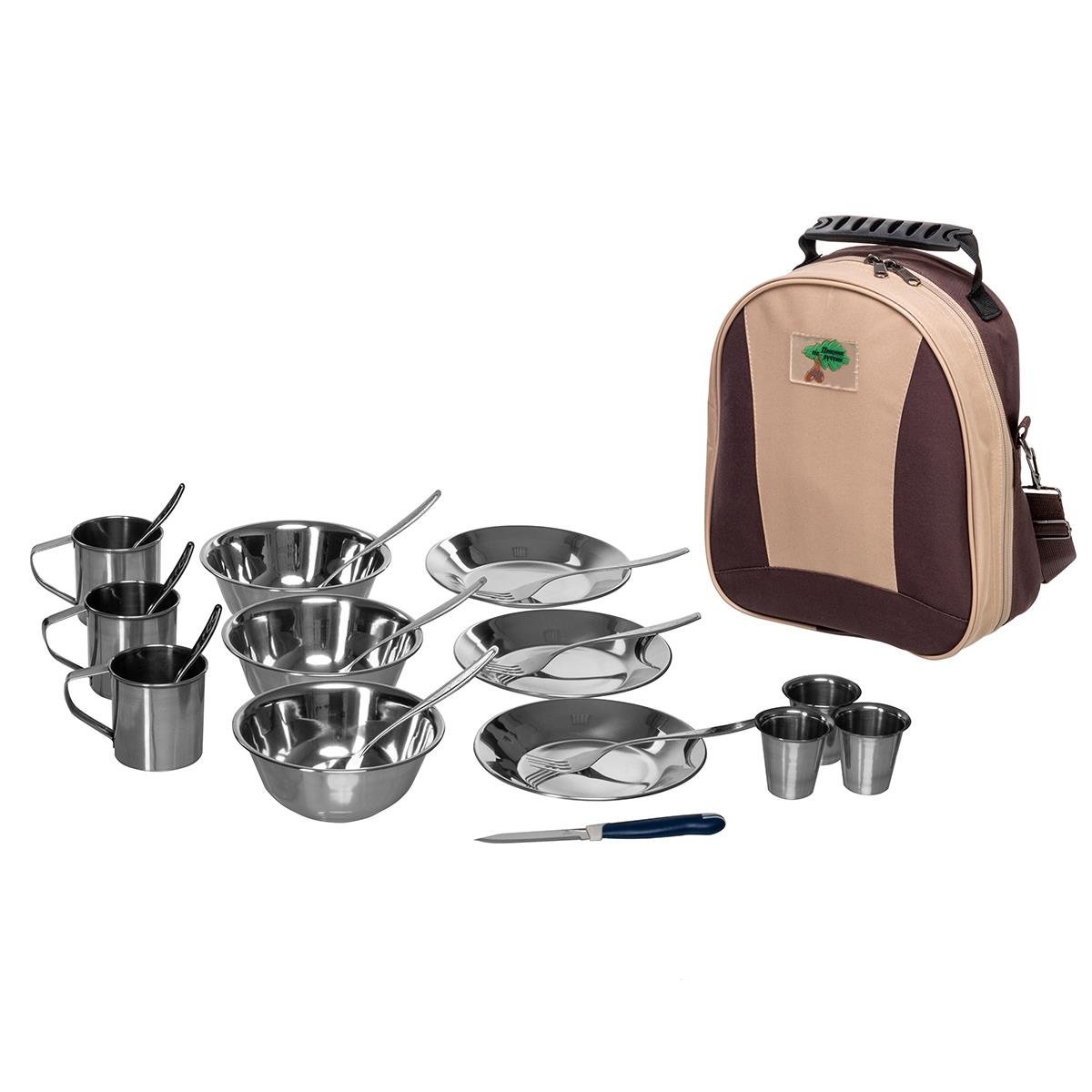 Вся необходимая посуда, чтобы два человека в любой момент могли быстро перекусить или плотно поесть в дороге или на природе, помещается в совсем небольшой кейс. Предметы для приема пищи изготовлены из легкой, прочной, долговечной нержавеющей стали, удобно упаковываются в специальные отсеки кейса и потому всегда будут под рукой.