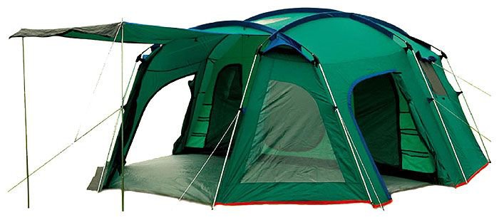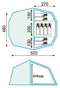 Палатка состоит из трех спальных зон в который можно попасть через 3 входа, полотна которого, в свою очередь, могут создавать козырек. Необходимые для этого стойки (материал - сталь) входят в комплект. Каждая из внутренних палаток рассчитана на 2-4 человек, что доводит общее число мест в модели до 8. Их объединяет большой наружный тент, сделанный из плотного полиэстера, который, за счет обработки, характеризуется устойчивостью к ультрафиолету, водо- и даже огнестойкостью. Высота спальных отделений и тамбура – до 2,1 м.