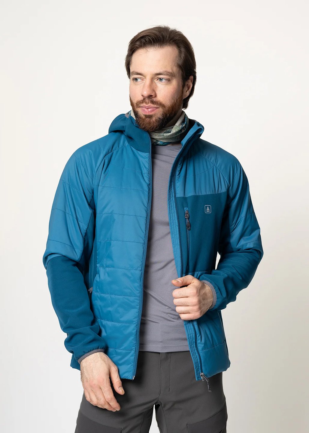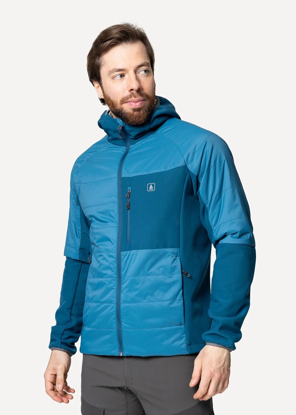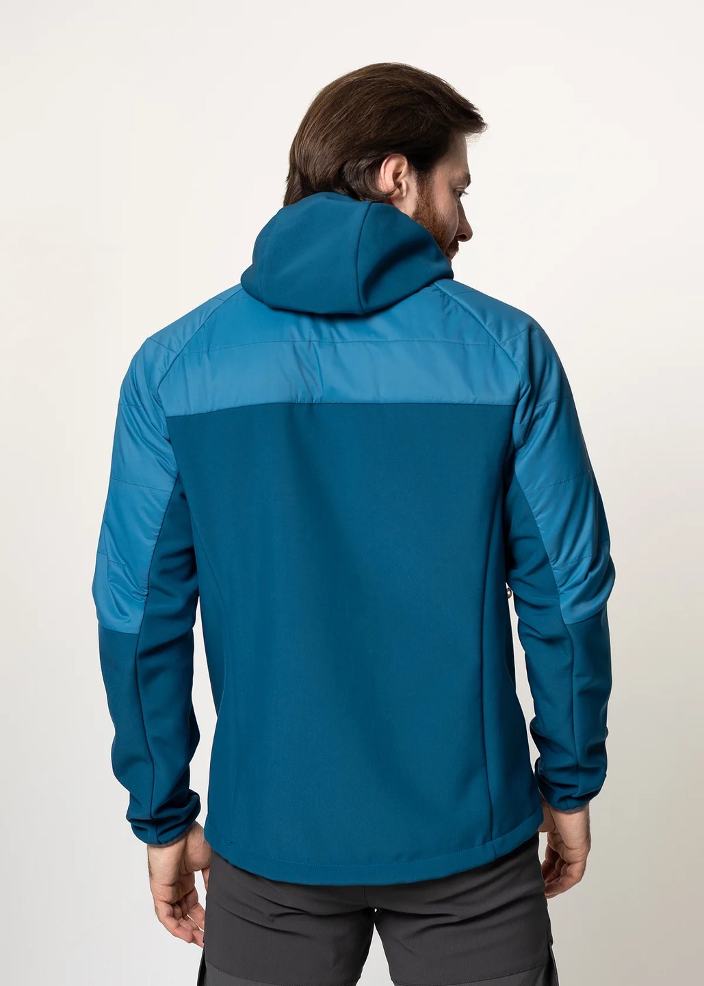 Мужская куртка гибридной конструкции: безмембранный тёплый софтшел с дополнительным утеплением и усиленной ветрозащитой передней части куртки, верха спины и плечей предоставляет оптимальный баланс тепла, ветрозащиты, дышимости и свободы движений в широком диапазоне нагрузок и погодных условий.