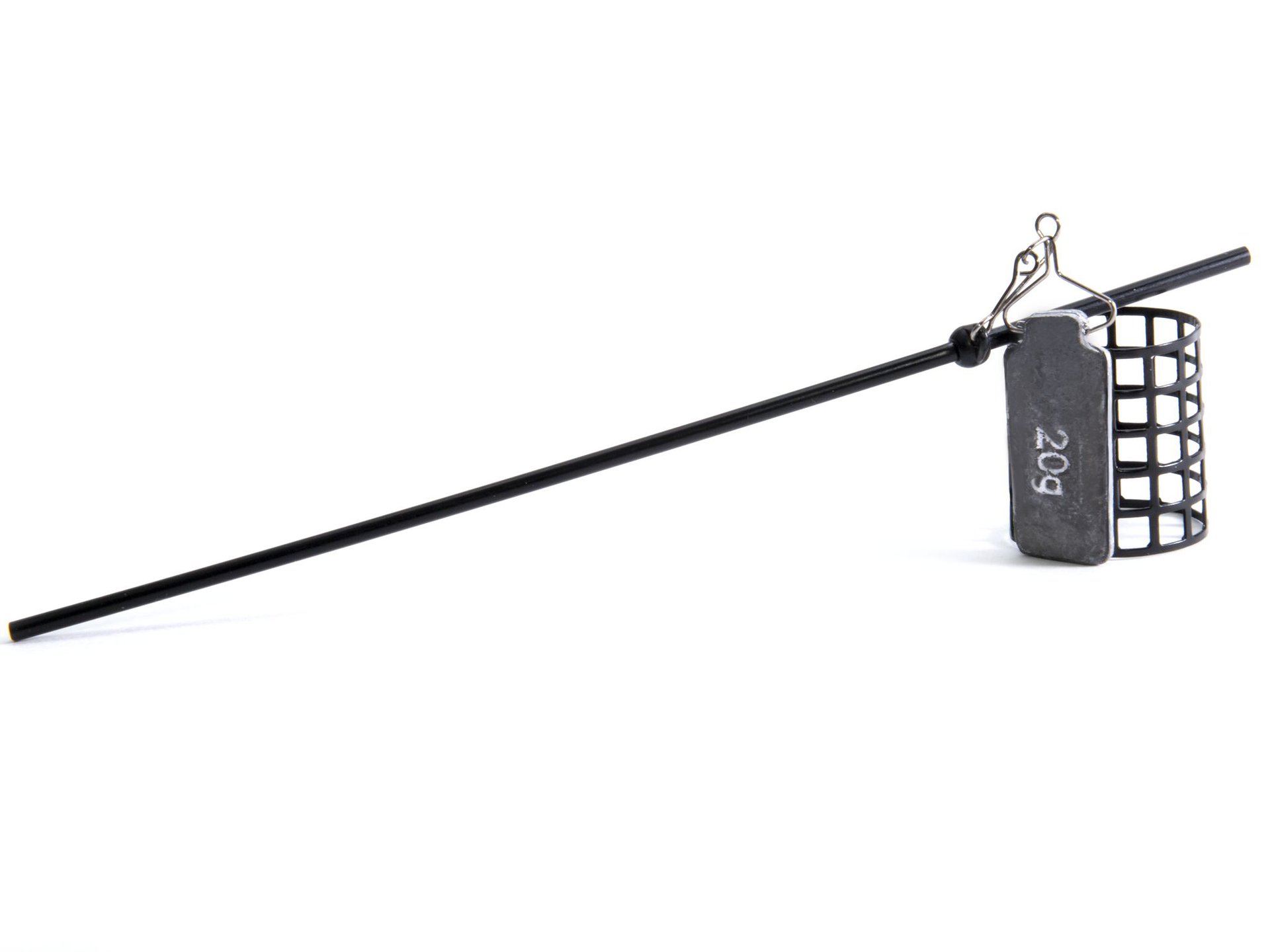 Удилище комплектуется двумя сменными вершинками разной жёсткости, а также фидерным монтажом, состоящим из пластикового противозакручивателя-трубочки и металлической кормушки-сетки весом 20г.