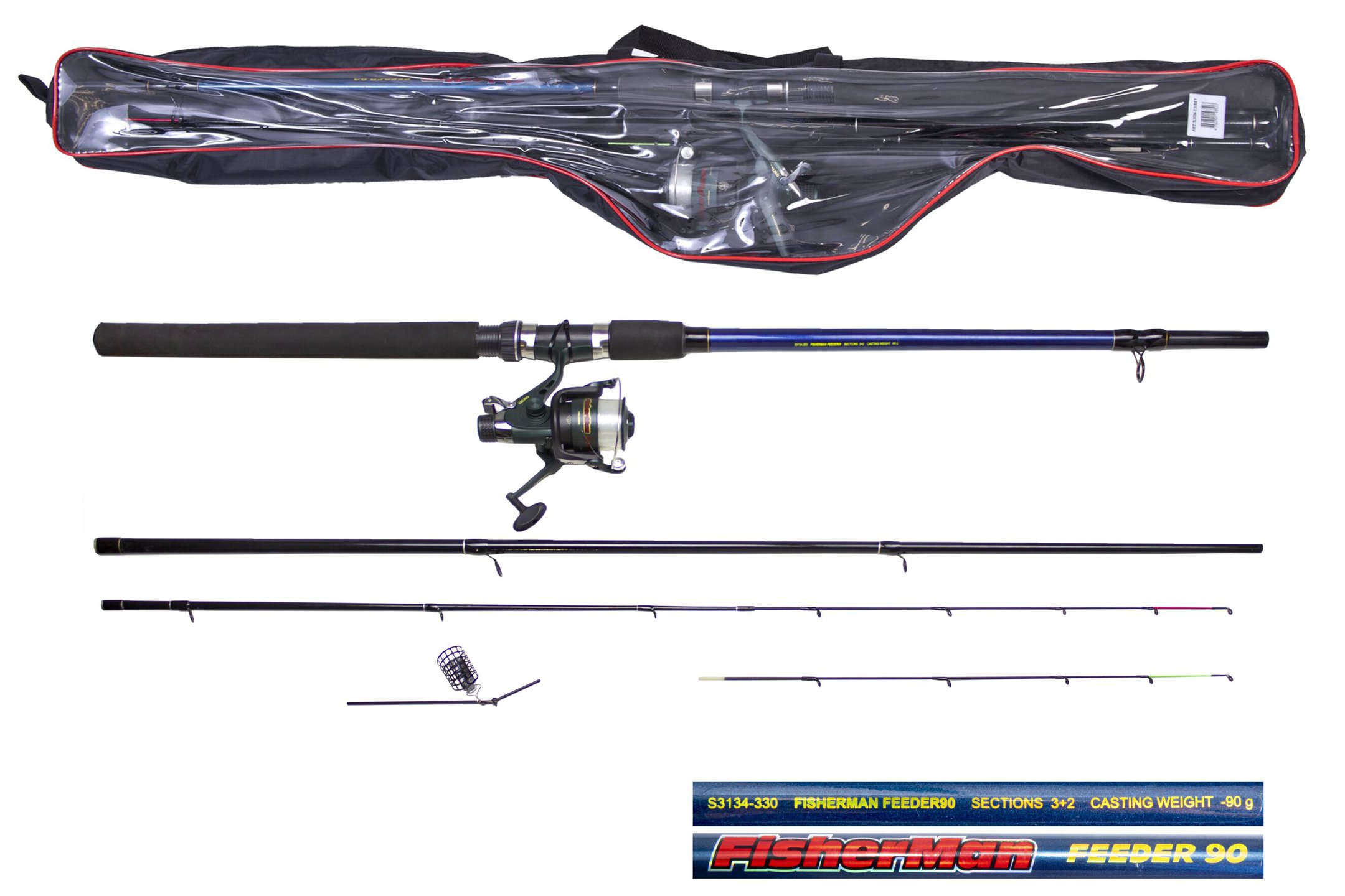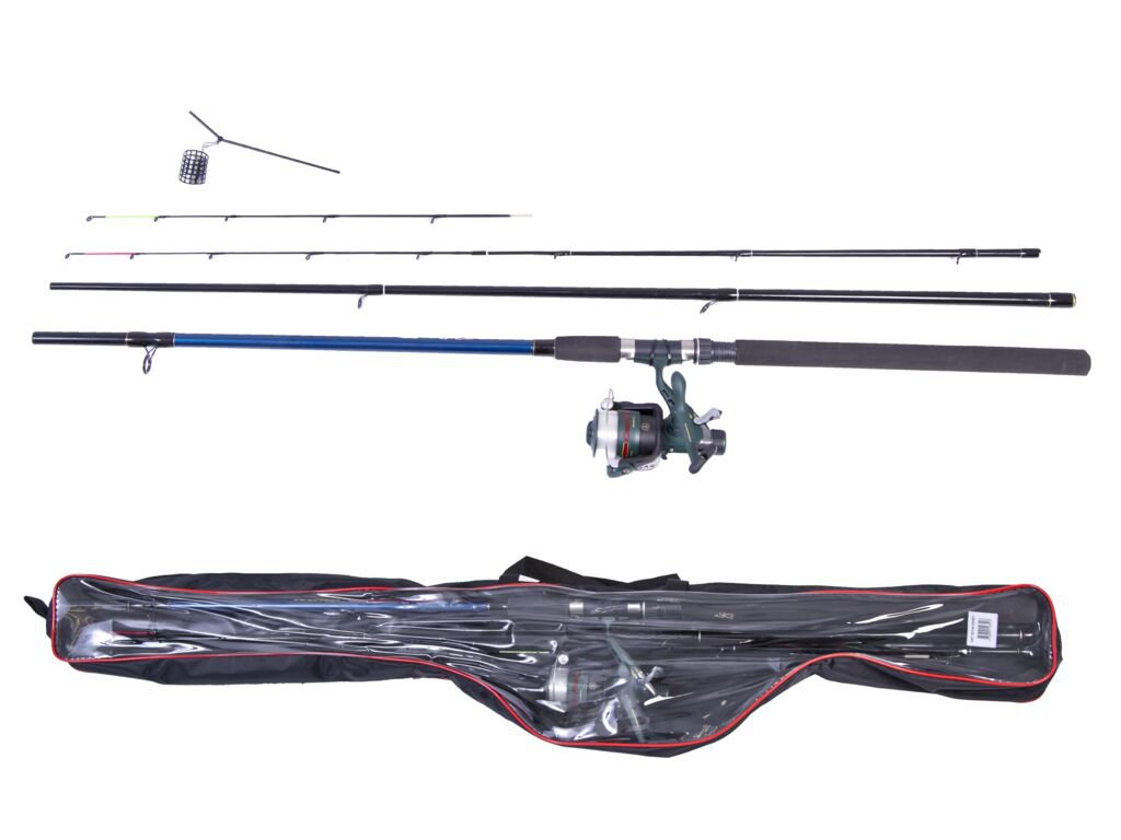 В комплект входит фидерное удилище длиной 3,3м с тестом до 90г, оснащённое безынерционной катушкой с намотанной на неё монофильной леской.