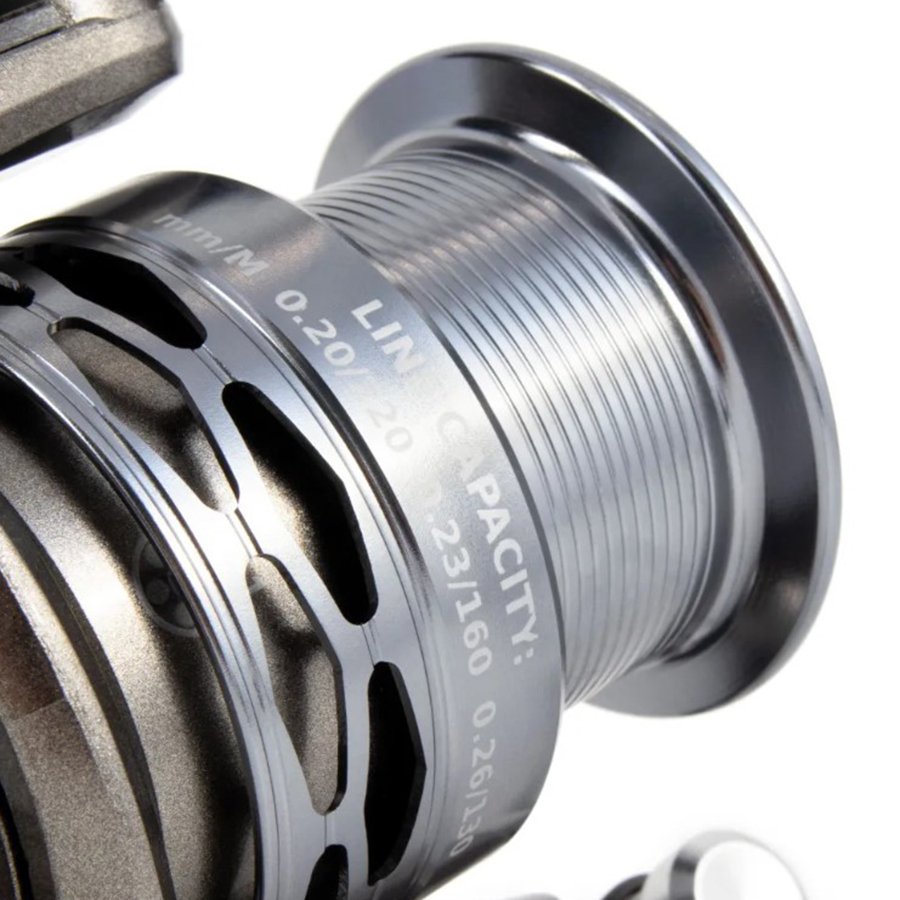 Катушка оснащена алюминиевой, холоднокованной основной шпулей, а также комплектуется дополнительной графитовой шпулей.