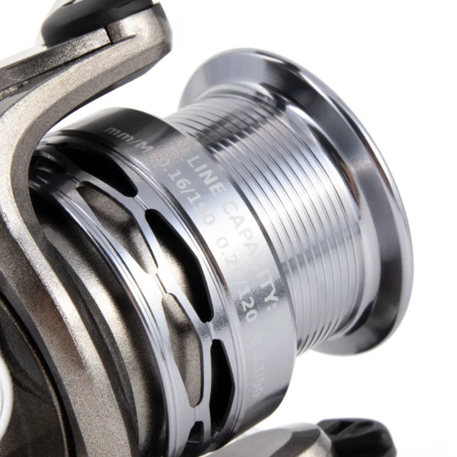 Катушка оснащена алюминиевой, холоднокованной основной шпулей, а также комплектуется дополнительной графитовой шпулей.