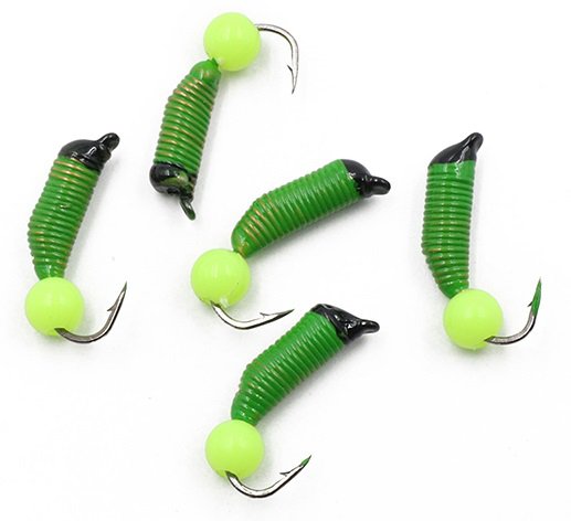 Копия личинки некрупного ручейника, вынутой из домика. В совокупности с крючком, на котором смонтирована, и напайкой представляет собой имитацию насекомого, насаженного на мормышку. Практика показывает, что такие копии часто работают результативней, чем служащие их прототипом естественные приманки. Цвета подобраны в соответствии с окраской наиболее распространенных видов насекомого. Приманка показывает хорошие результаты как по открытой воде, так и при ловле со льда.