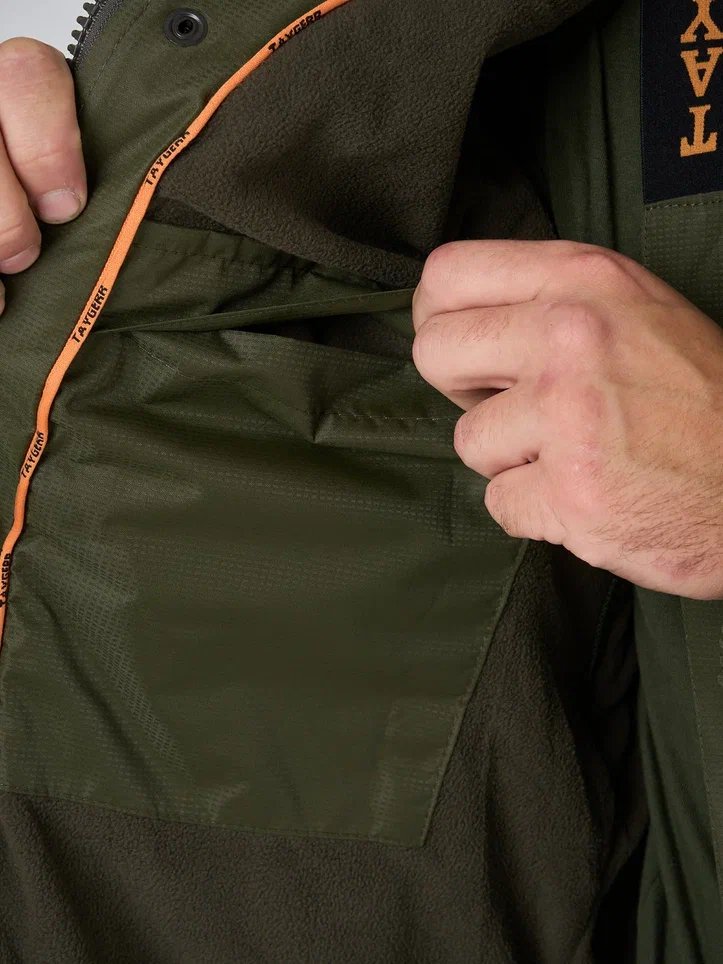 "Корсар -5" выполнен из материала таслан — это гладкий, немного шуршащий материал, обладающий высокой прочностью и отличными водоотталкивающими свойствами. Преимуществом данного материала является и то, что за ним легко ухаживать. Несложные загрязнения можно удалить при помощи влажной салфетки, и это очень удобно, ведь после целого дня на рыбалке можно не переодеваться, а быстро почистить костюм прямо на парковке, сесть в машину и поскорее оказаться дома.