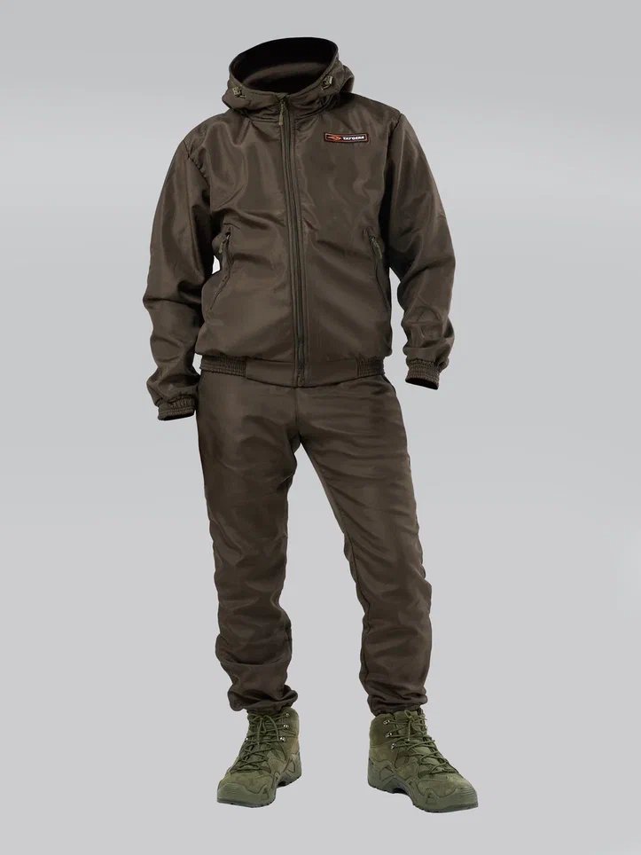 Костюм выполнен из двухслойного материала Дюспо-флис. Этот материал имеет ряд преимуществ. Внешний слой изготовлен из синтетических волокон и обработан полимерной пропиткой, поэтому материал обладает влагоотталкивающим эффектом и устойчив к ветру.