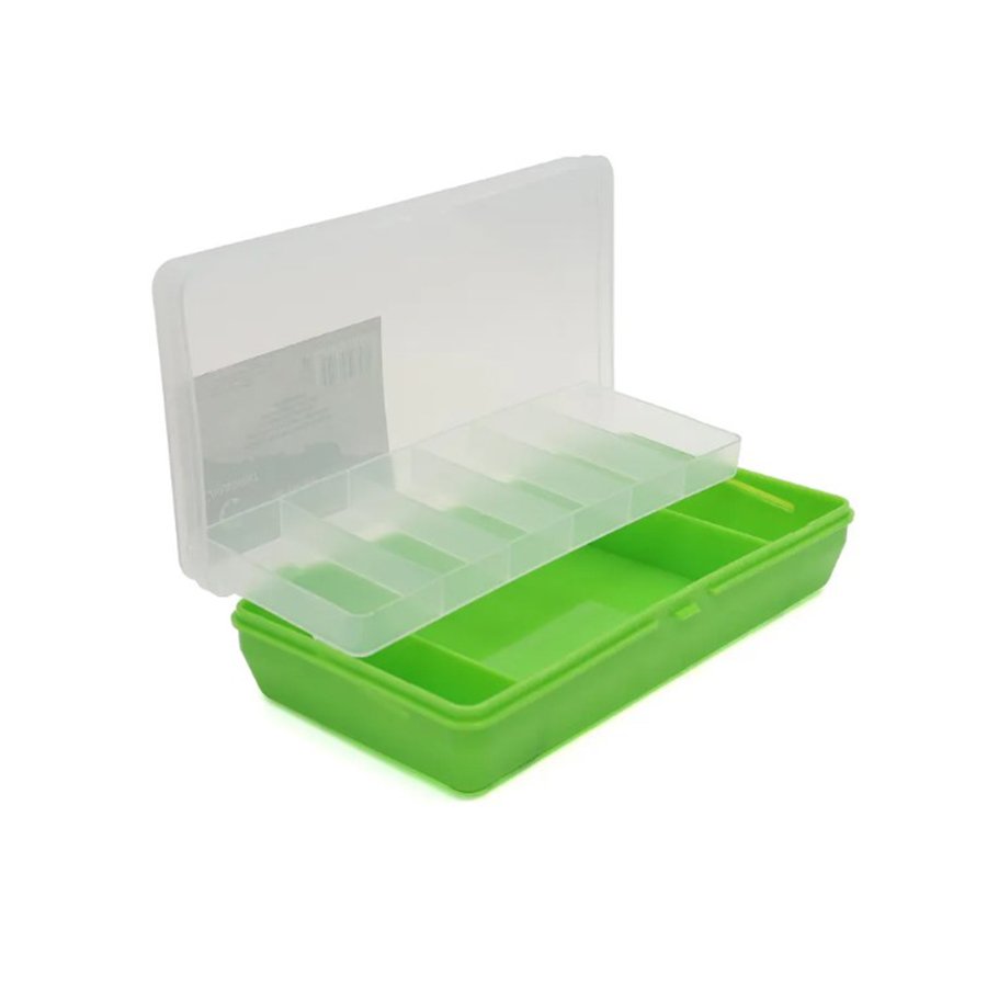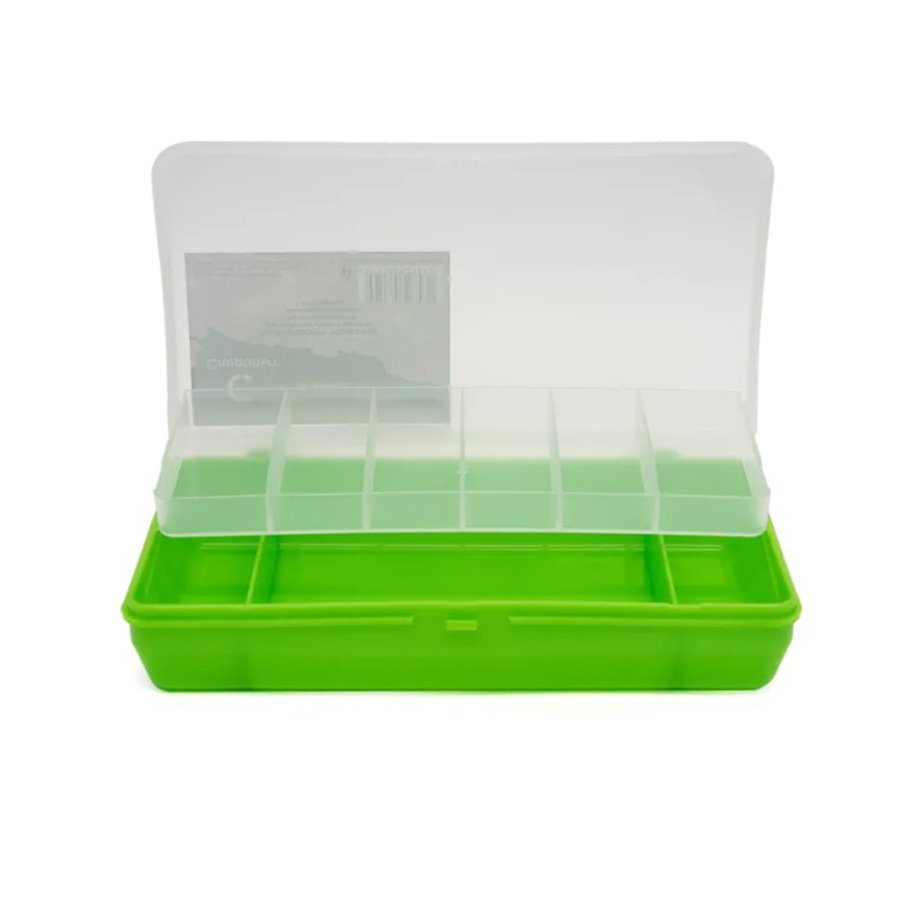 Удобный и практичный бокс для хранения и перевозки приманок, воблеров и блесен. Имеет прочную защелку и поднимающуюся полку на 6 отделений.
