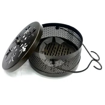 Футляр имеет оригинальную форму и современный дизайн, и может использоваться как на открытой местности, так и в доме, квартире или на даче. На дне футляра есть специальный поддон, предназначенный для сбора пепла, который не проводит тепло и не раскаляет поверхность, на которой стоит подставка. Конструкция оснащена крышкой с отверстиями и имеет сетку по периметру футляра для выхода дыма. Данная модель оснащена крючком для тления антимоскитной спирали в подвешенном состоянии.