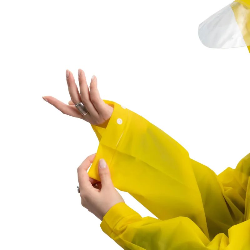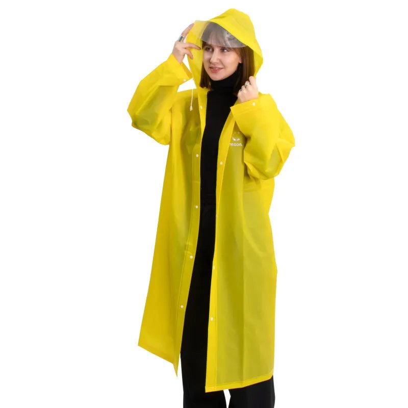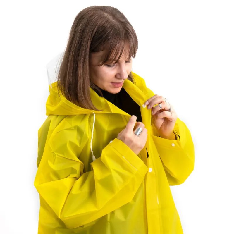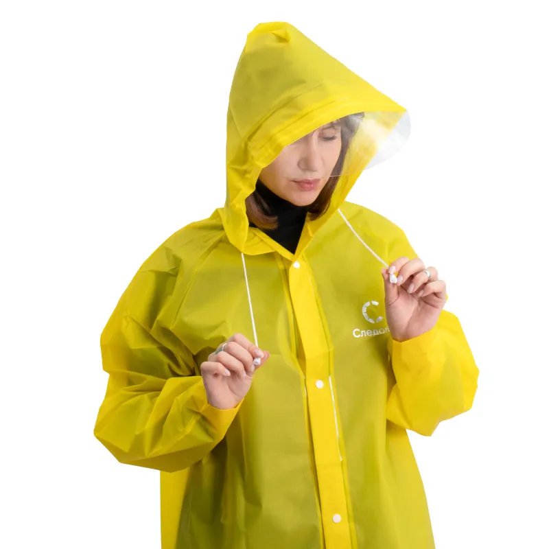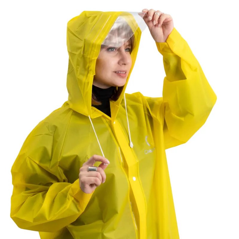 Плащ-дождевик изготовлен из плотного материала EVA и оснащен прозрачным пластиковым козырьком, который защищает лицо от дождя и не ограничивает обзор. Прозрачный козырек отлично защищает головной убор от промокания.