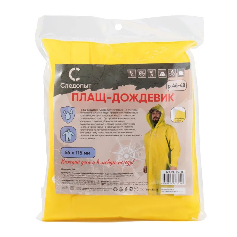 Плащ-дождевик Следопыт, плотный EVA, с козырьком на капюшоне и чехлом, Желтый, 66х115 см