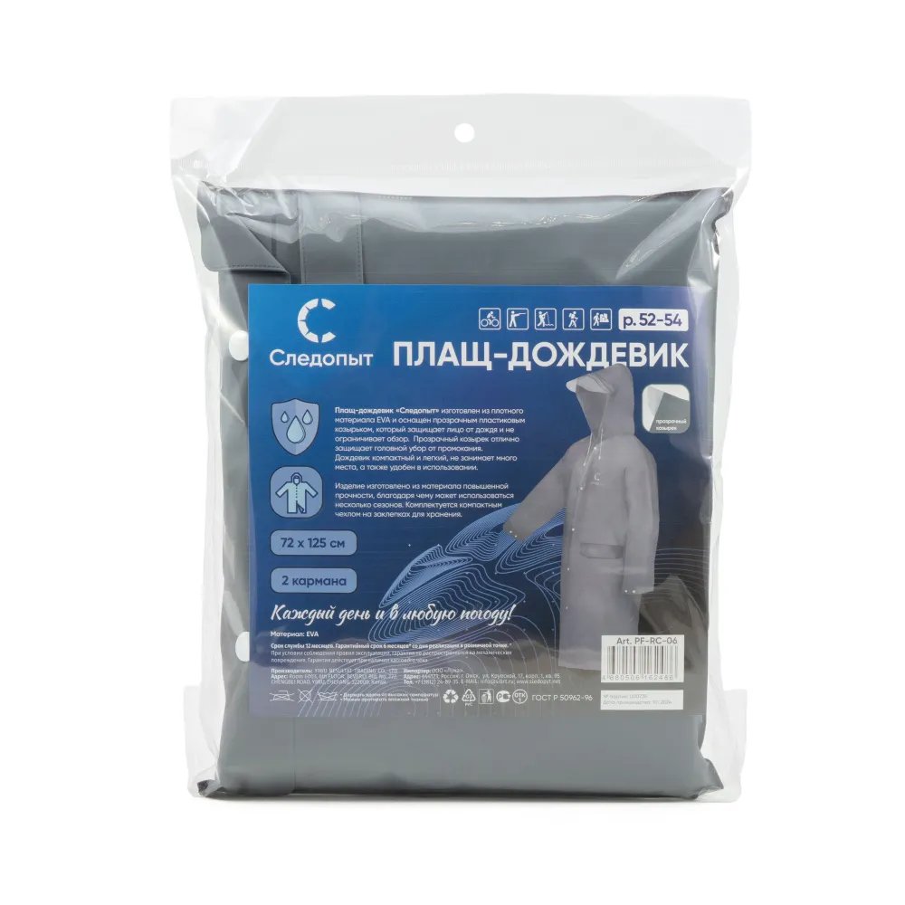 Плащ-дождевик Следопыт, плотный EVA, с козырьком на капюшоне и чехлом, Серый