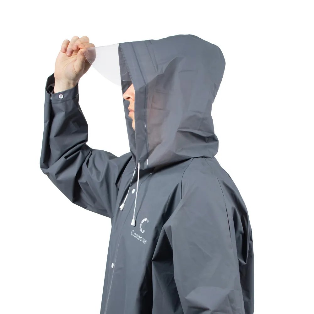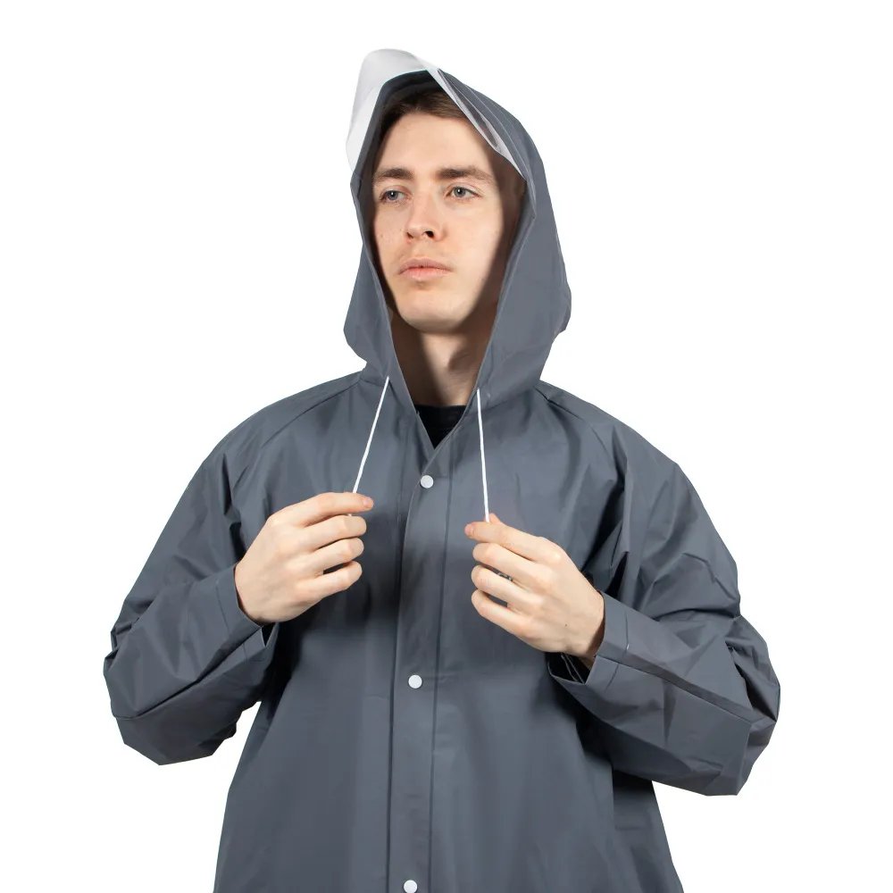 Плащ-дождевик изготовлен из плотного материала EVA и оснащен прозрачным пластиковым козырьком, который защищает лицо от дождя и не ограничивает обзор. Прозрачный козырек отлично защищает головной убор от промокания.