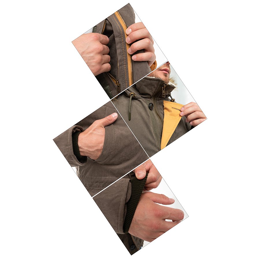 - Притачной капюшон с пристегивающийся меховой отделкой по лицевому вырезу, с регулировкой объёма по лицевой части