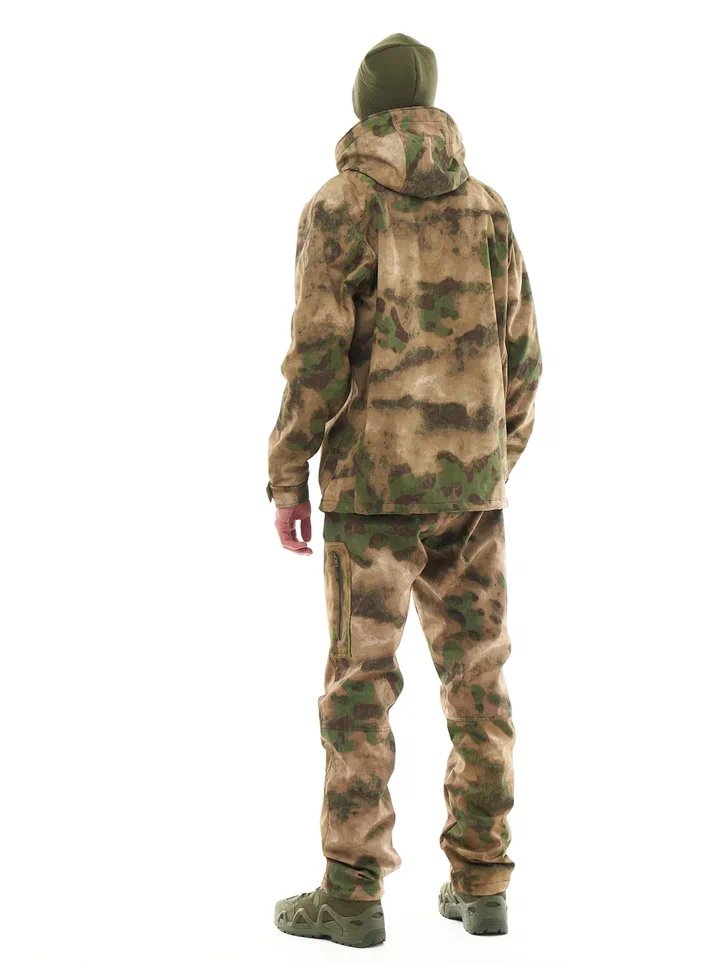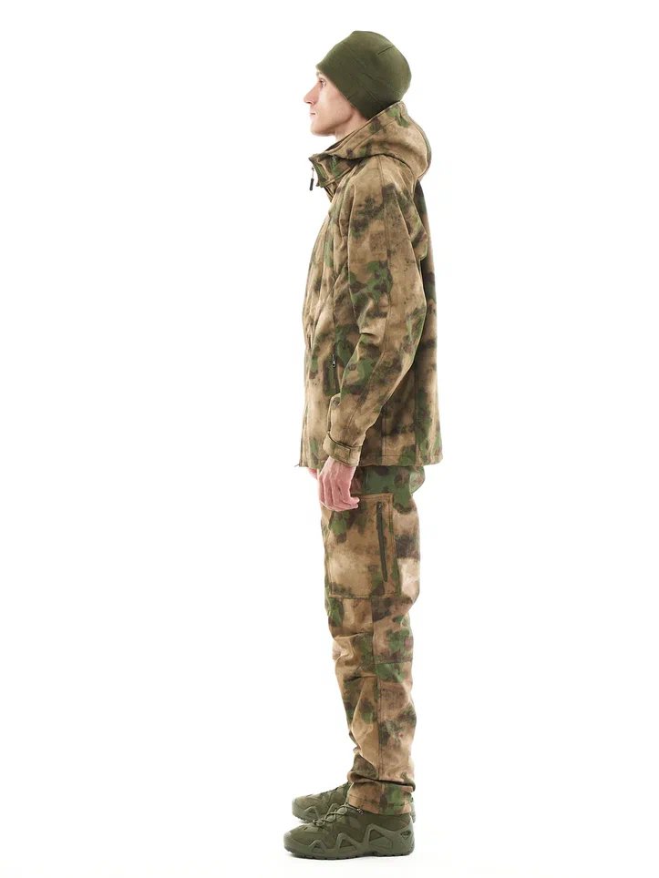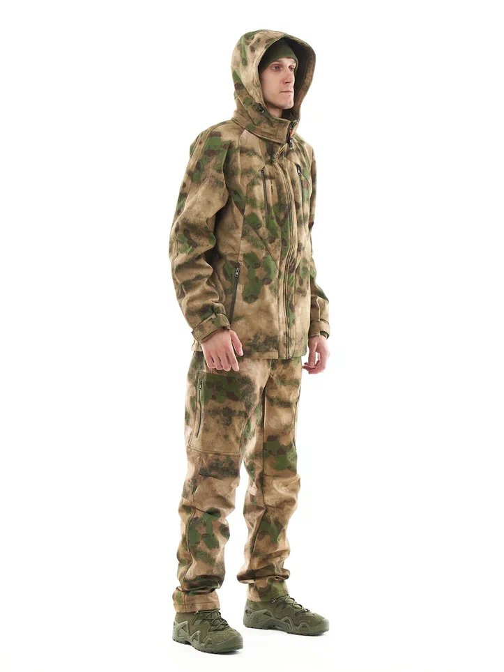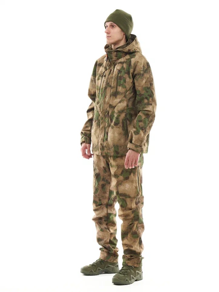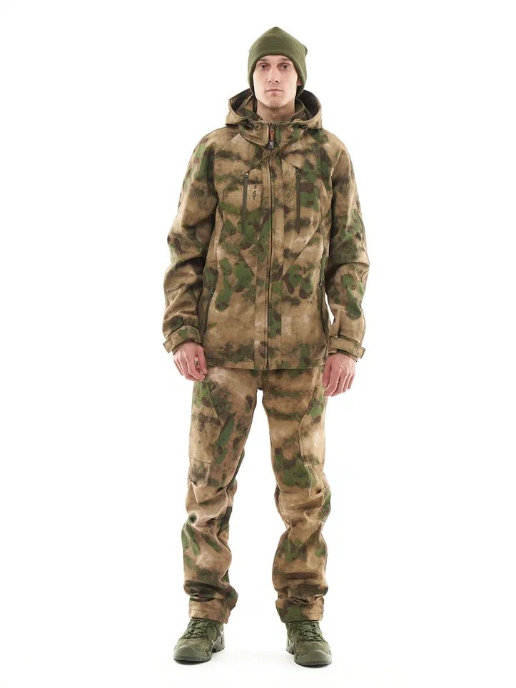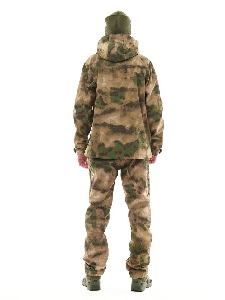 Костюм выполнен из софтшелла — это трехслойный материал, верхний слой которого гладкий, он прост в уходе, и обладает высокой прочностью. Внутренний слой - это мягкий флис с отличными теплосберегающими характеристиками. Средний слой в материале софтшелл - это мембрана, которая обеспечивает защиту от осадков и ветра.