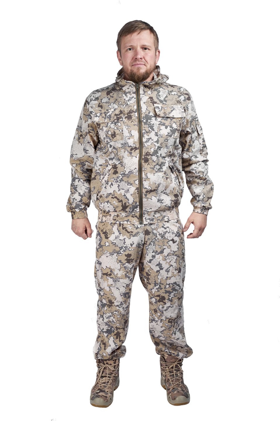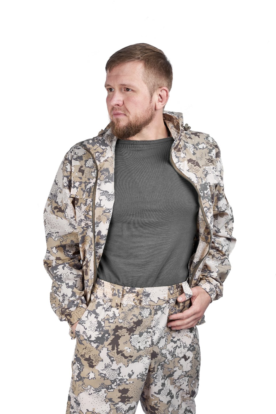 Этот костюм состоит из удобной куртки и практичных брюк, которые обеспечивают комфорт и защиту во время активного отдыха на природе.