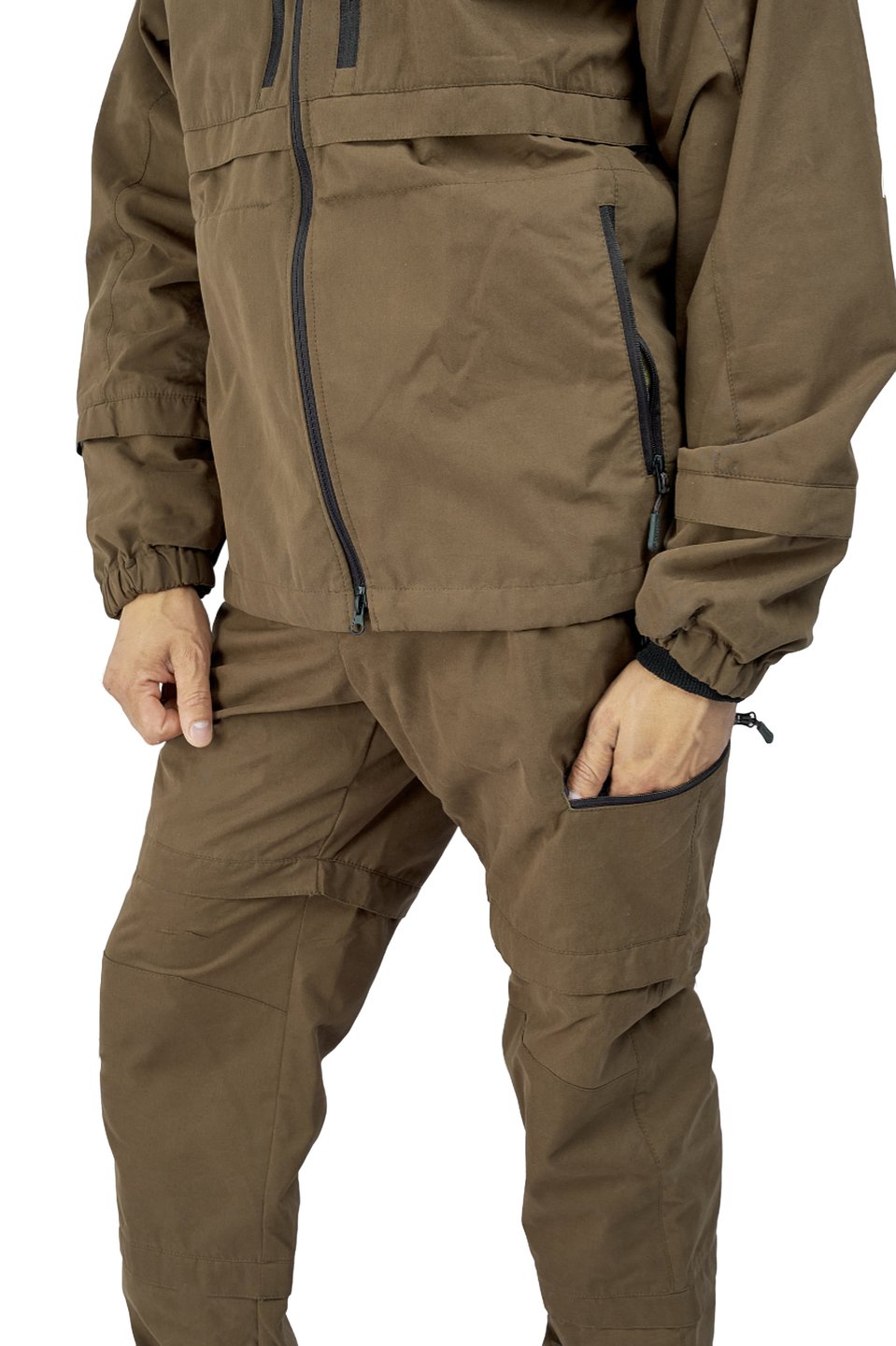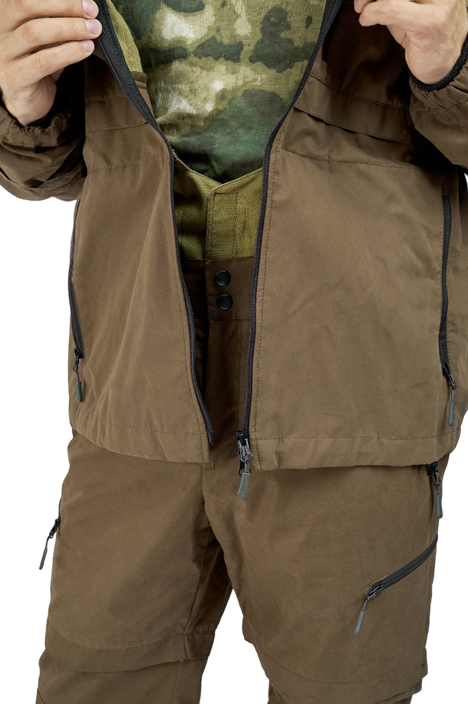 Изделие выполнено в современном дизайне. 4 больших кармана на молнии на куртке и 4 больших кармана на брюках (2 из них на молнии).