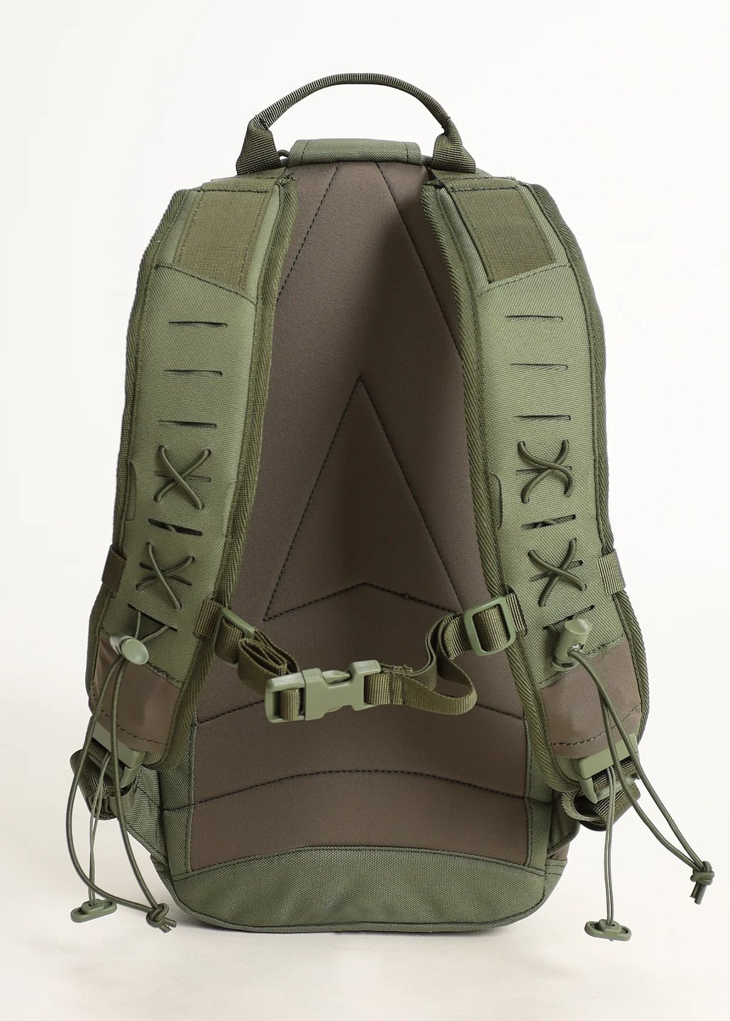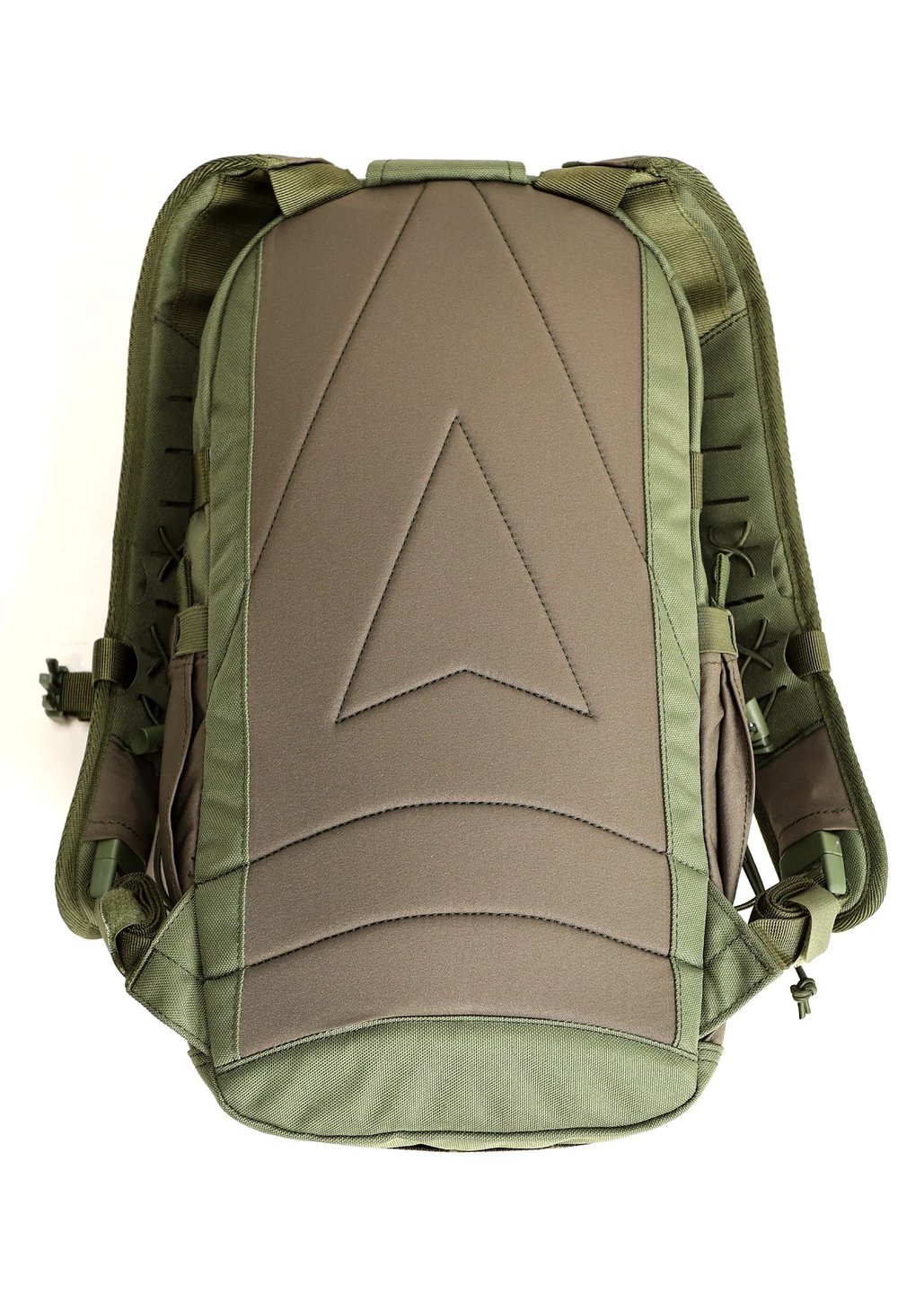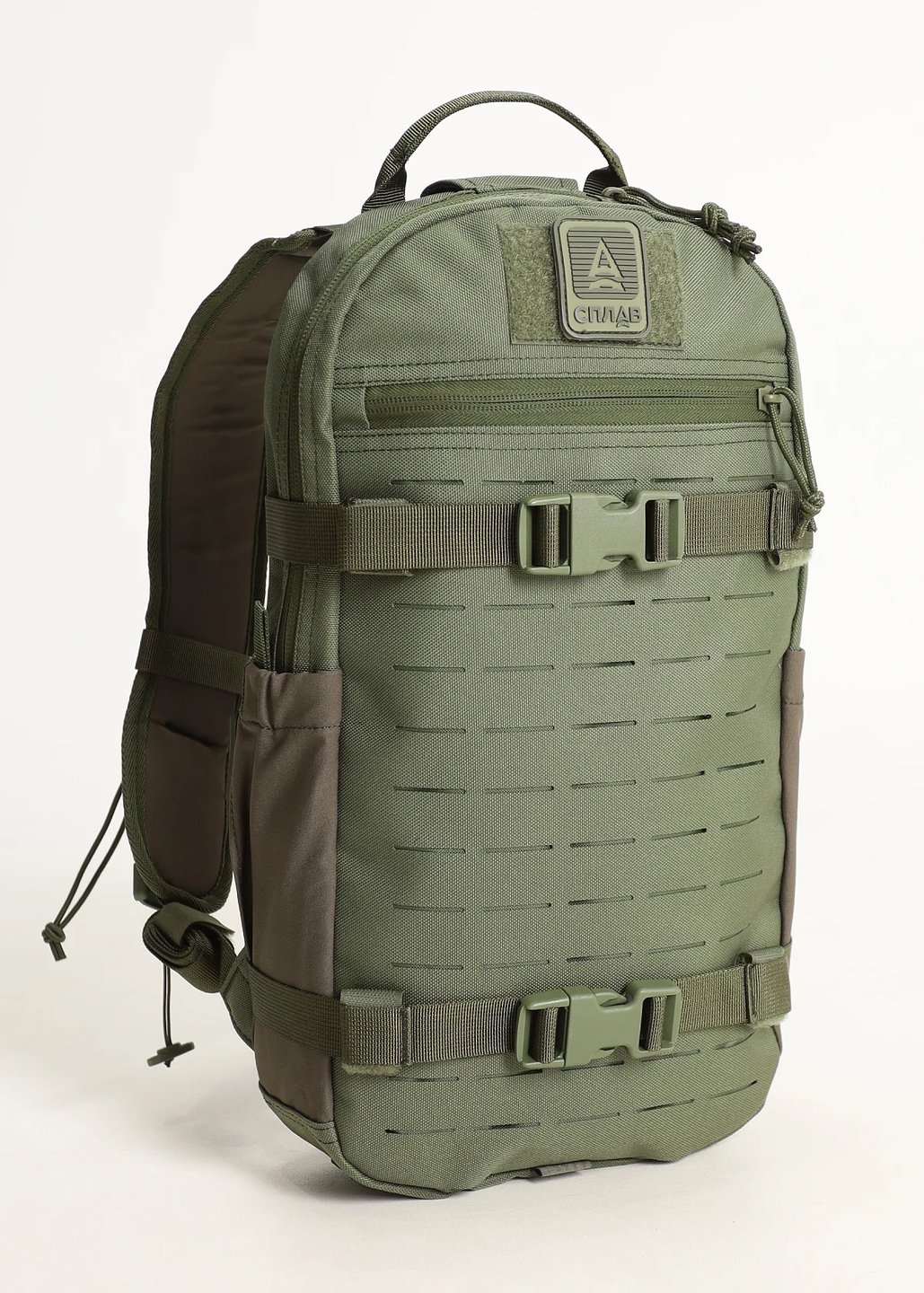 На лямках панели из ламината с функциональными прорезями, выполненными лазерной резкой — PALS/MOLLE для крепления малых подсумков, эластичный шнур для крепления трубки питьевой системы и прочих предметов, и два различных по расположению крепления грудной стяжки.