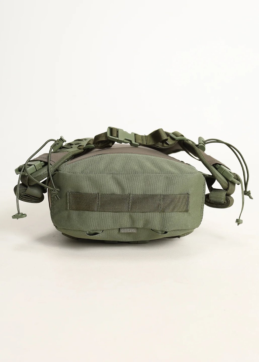 На дно рюкзака нашита стропа с ячейками для крепления дополнительного груза. Под стропой расположены два скрытых люверса для дренажа воды. Дно усилено с изнанки вторым слоем легкой ткани.