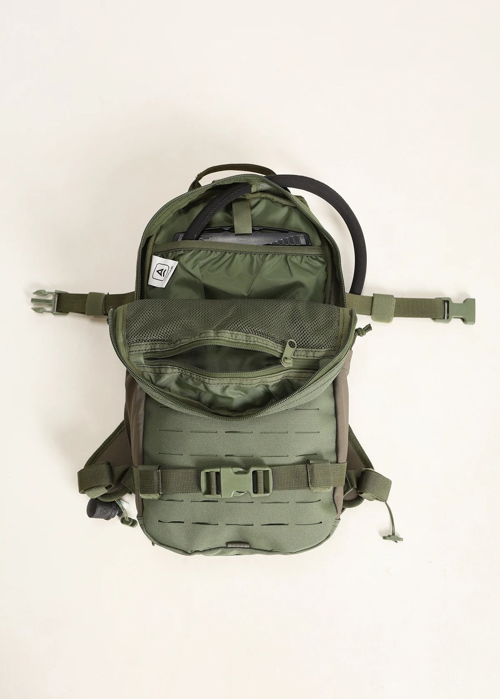 Совместимость с питьевыми системами — на изнанке спины расположен объемный карман для гидратора (в комплект не входит), с открытым подрезиненным верхом. Подходит для гидраторов емкостью до 3 л включительно. Сверху имеется подвес для гидратора из стропы с липучками и клапан для вывода трубки питьевой системы наружу.