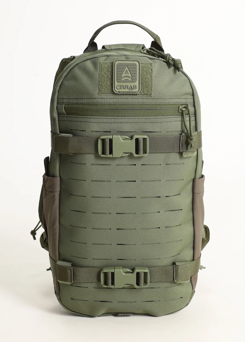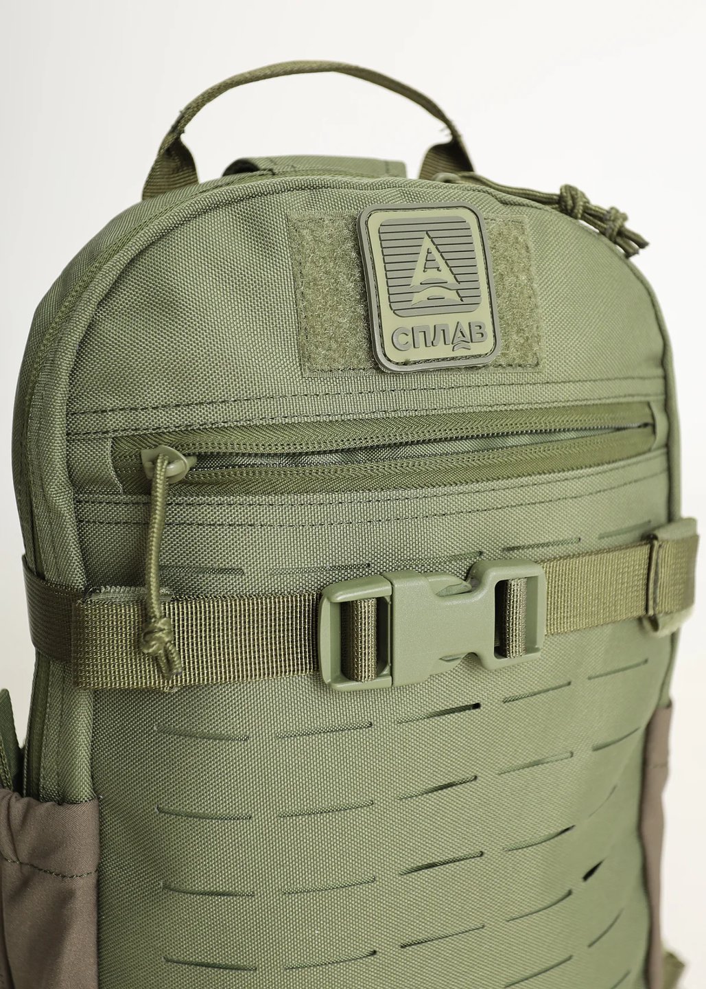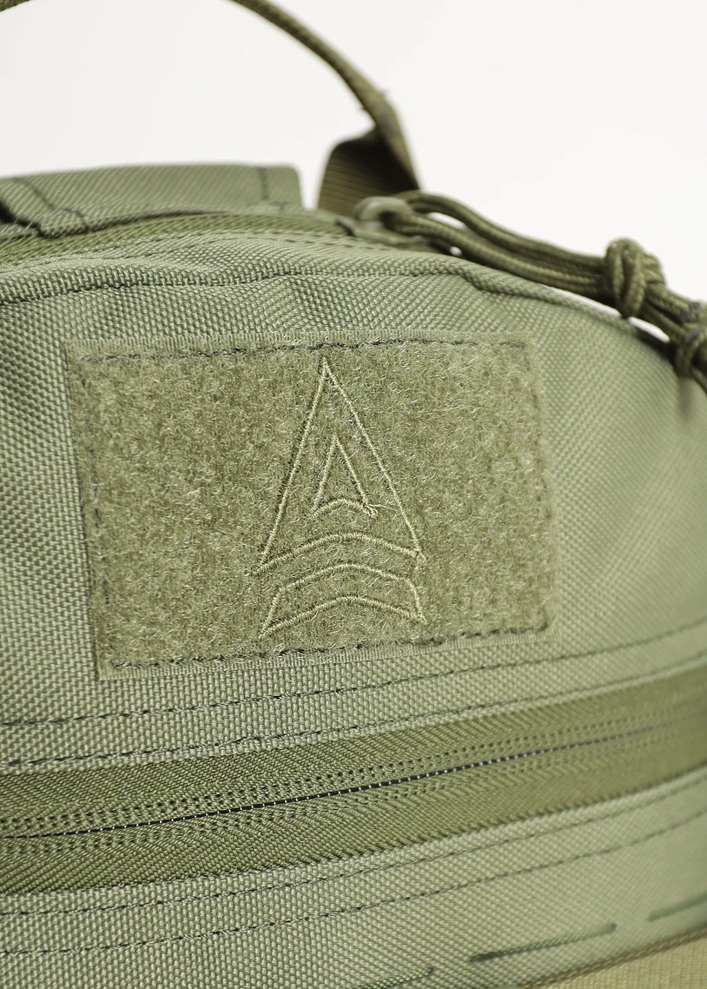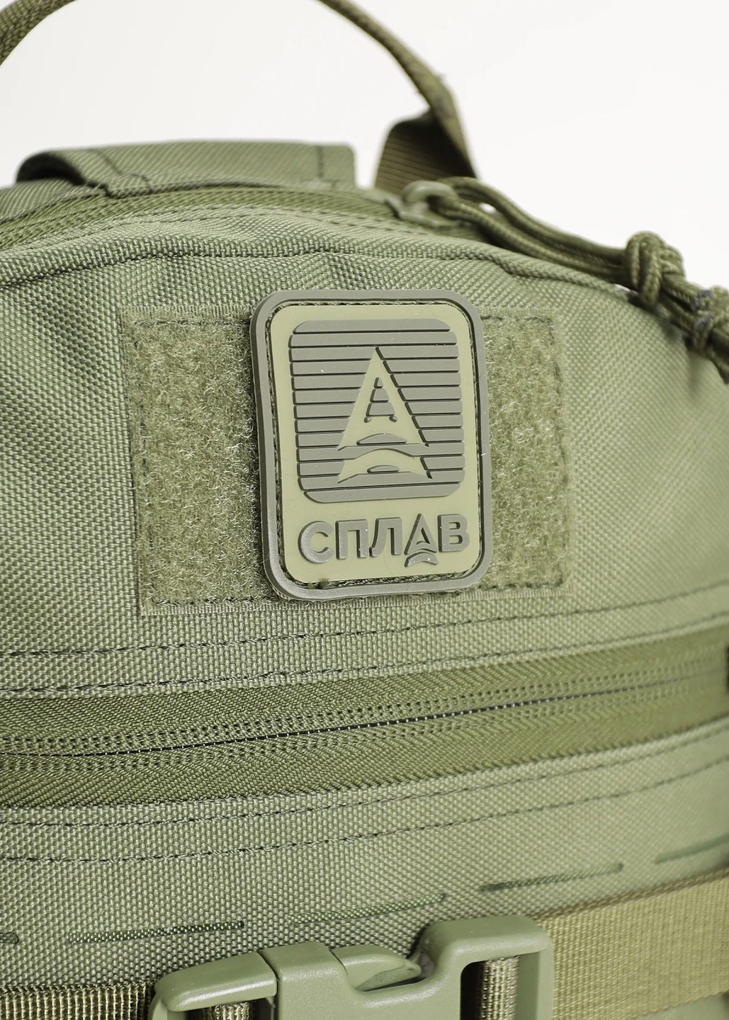 Внешний передний карман на горизонтальной молнии. Над карманом нашита липучка (7,5×5 см) для крепления шевронов, съемный ПВХ логотип в комплекте.