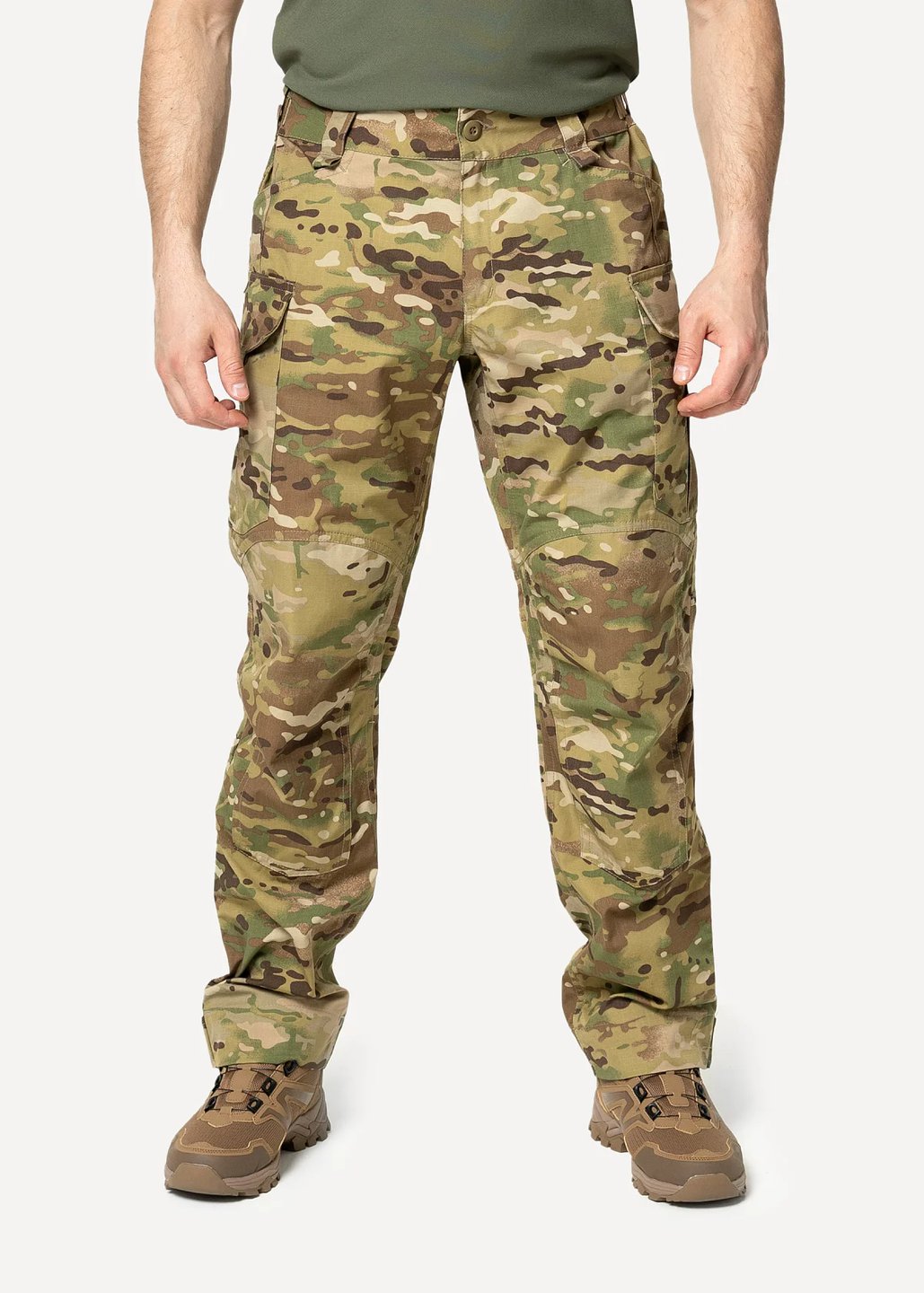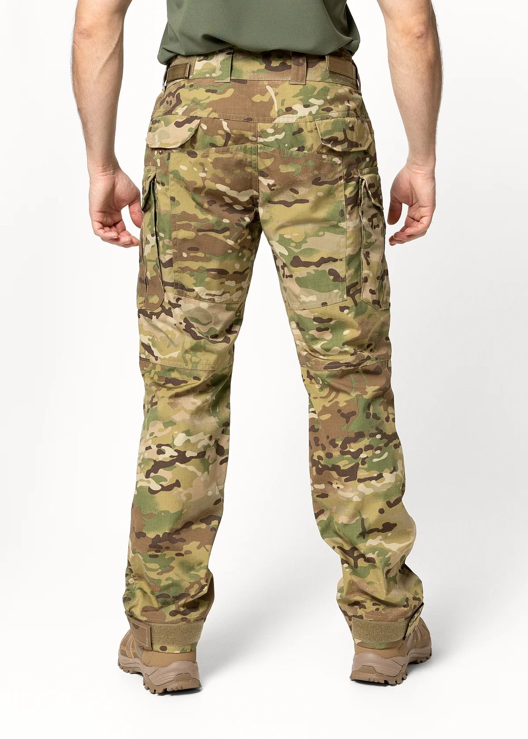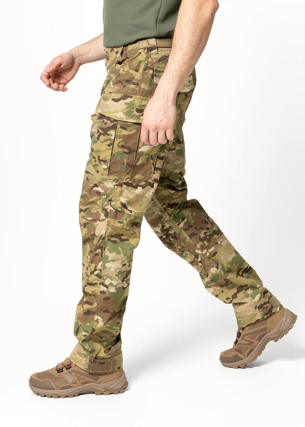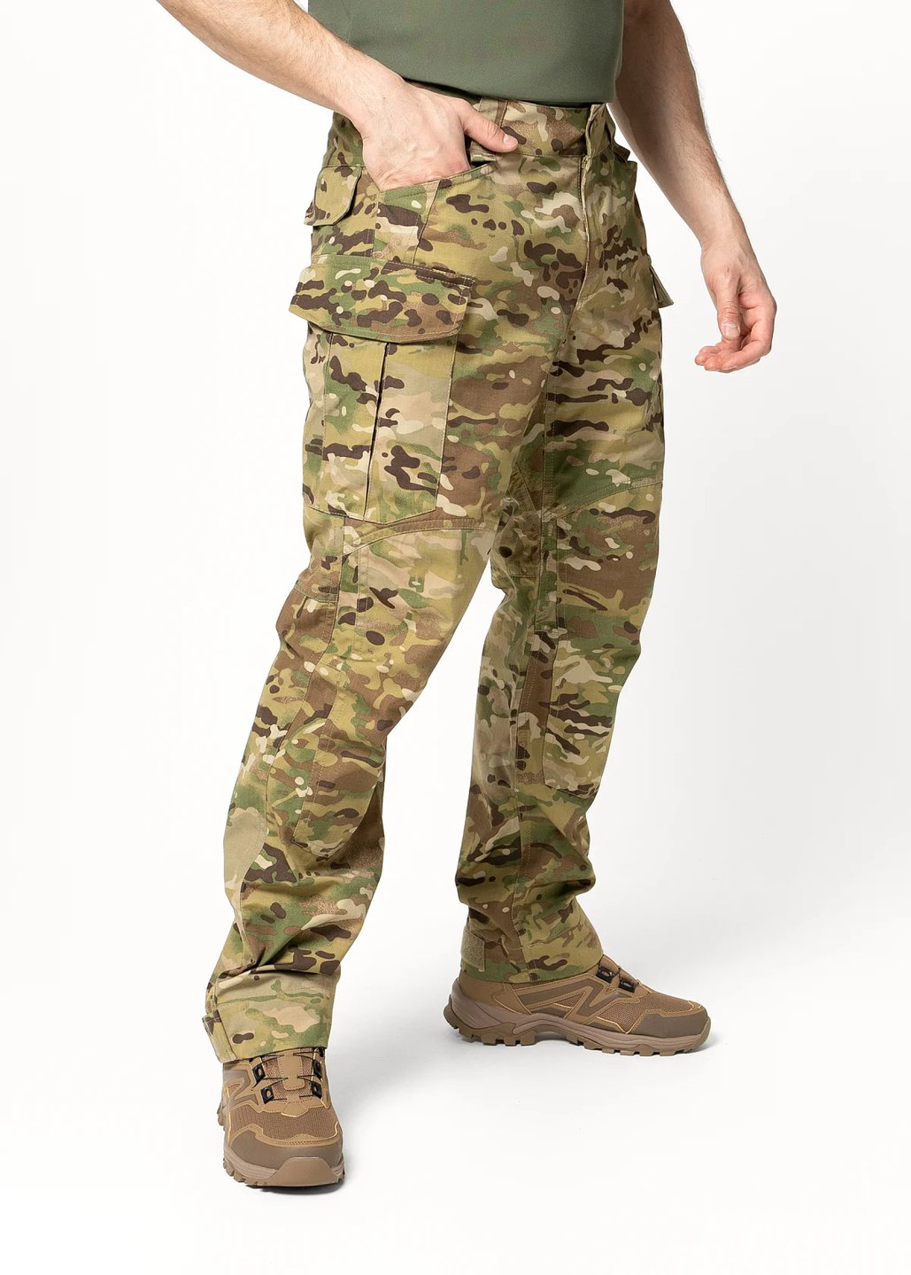 Врезные задние карманы с клапанами на липучках. Боковые подрезные карманы с открытым верхом и усиливающими накладками для защиты от протирания клипсой складного ножа. Артикулированные колени с боковыми вытачками, усиливающие накладки из основной ткани (установка ударозащитных вставок не предусмотрена). Крупные грузовые карманы с вертикальными складками для создания дополнительного объема, с клапанами на липучках.